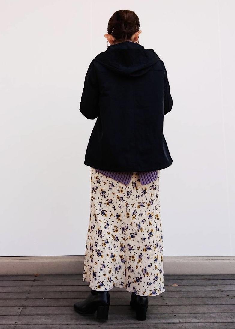 カジュアルスタイルによく合うマウンテンパーカーを、スカートに合わせてきれいめに着ました。 ハリのあるマンパは、きれいめなスタイルにもマッチします。