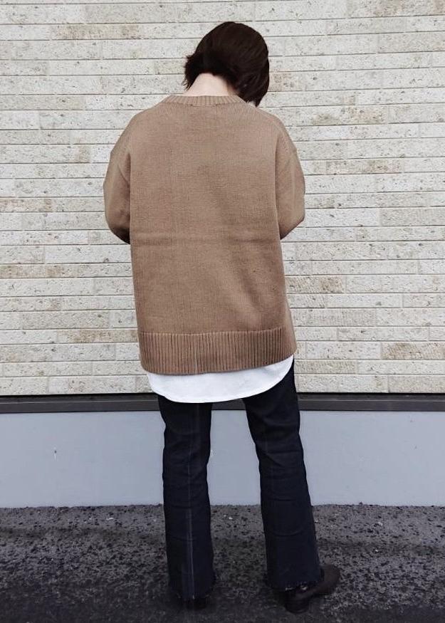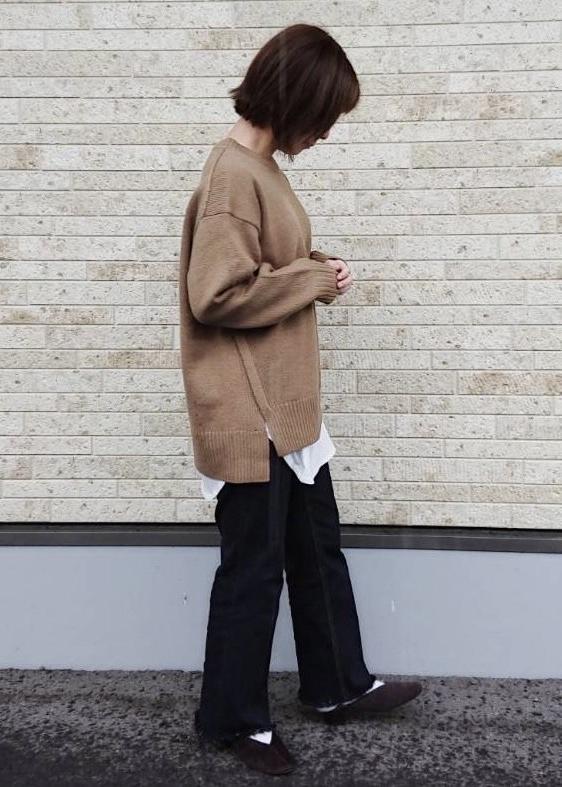 シンプルなブラウンニットを、白いカットソーとレイヤードしました。