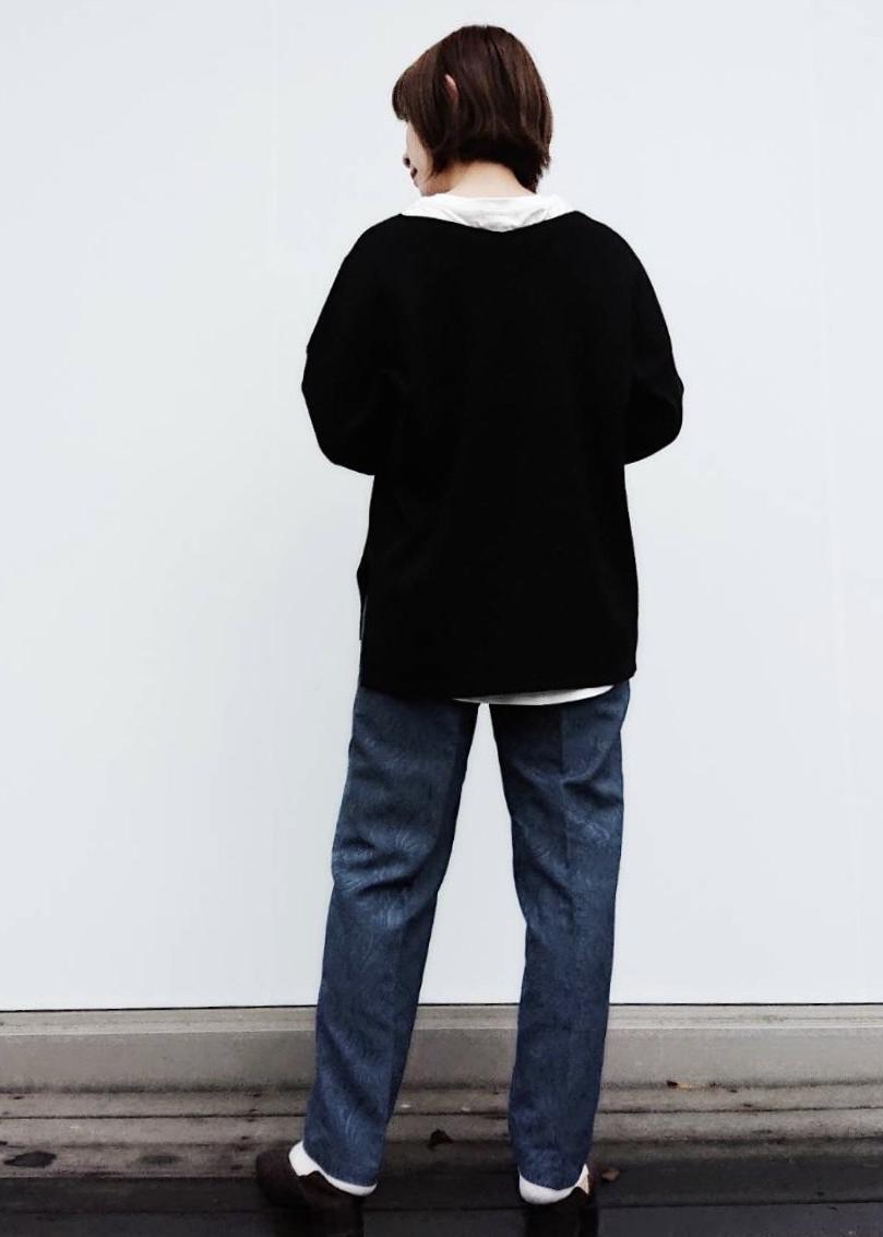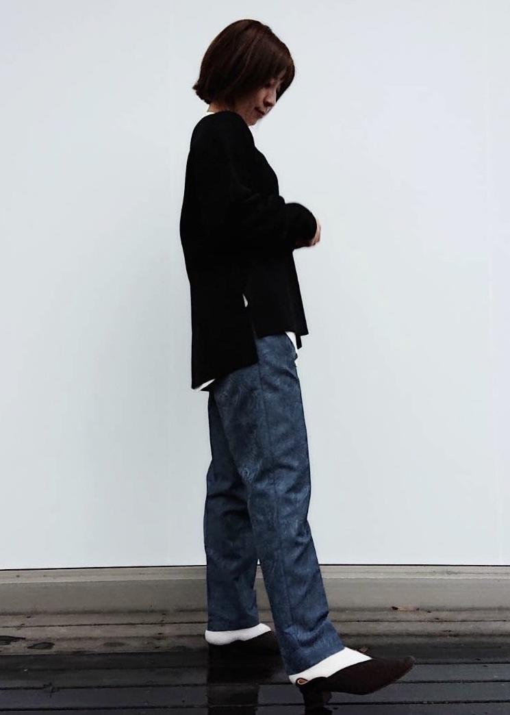 ブルーのジャガードパンツが主役のコーディネイトです。 パンツが引き立つように、シンプルなニットを合わせました。