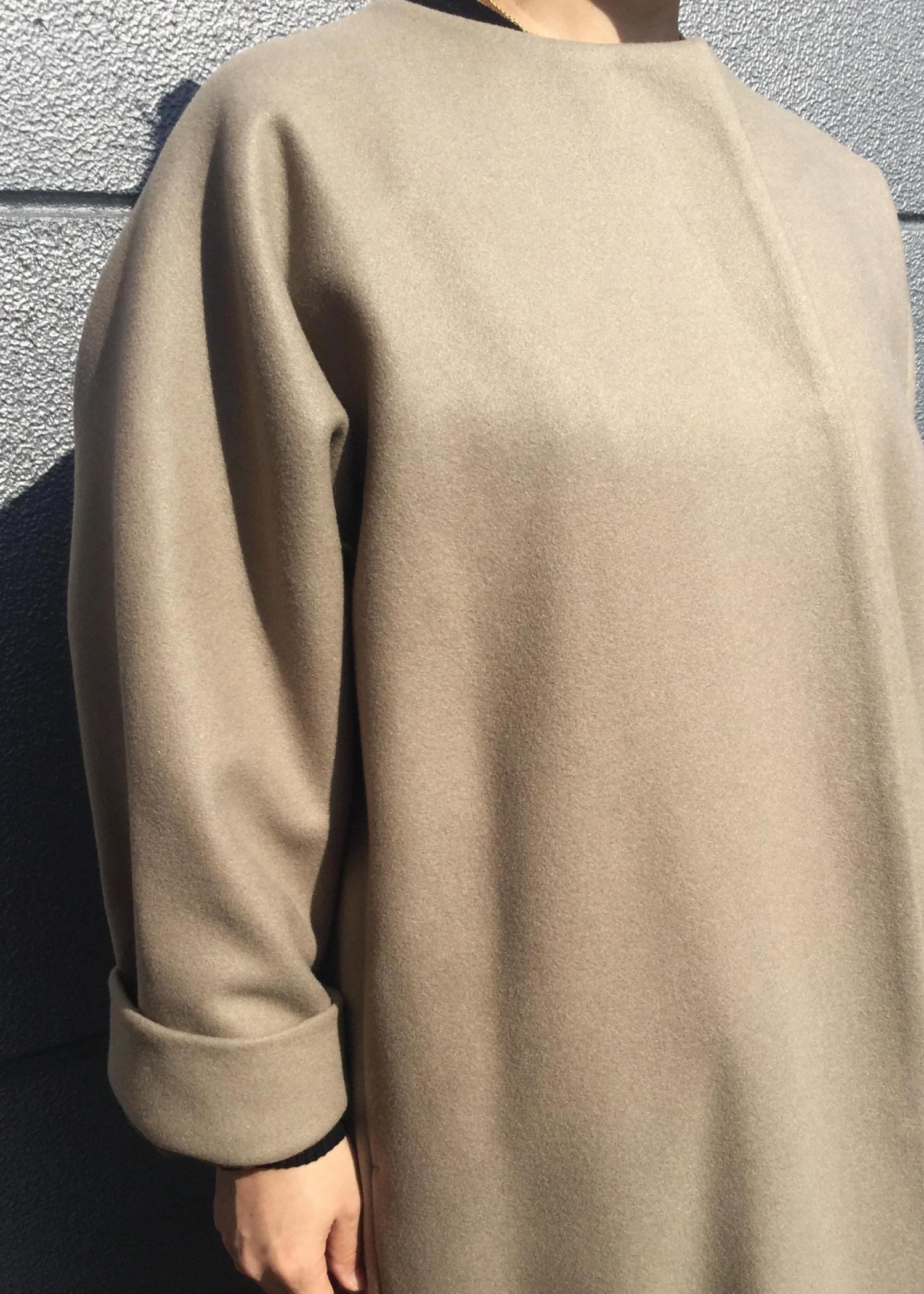 ドルマンスリーブなのでインナーを選ばず、楽ちんな着心地ながらすっきり見えるミニマルなデザイン。