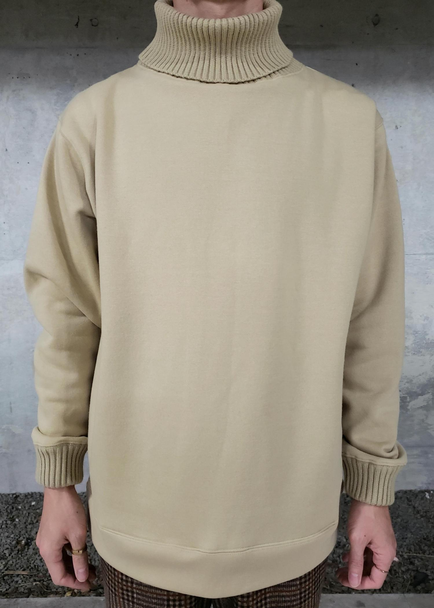 リブを使ったタートルにチェックパンツを合わせ黒の小物で引き締めました。トップスとボトムは厚手で暖かく、しかも軽いのが特徴。コート着用時にも首もとの寒さは気になりません。