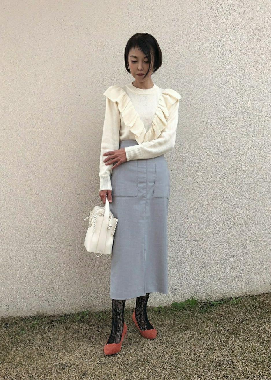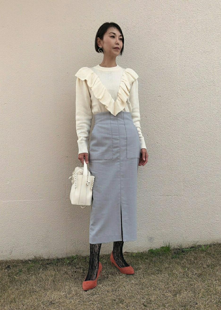 白のフリルニットとハイウエストタイトスカートを合わせ、甘さを抑えた綺麗めコーディネートにしました。