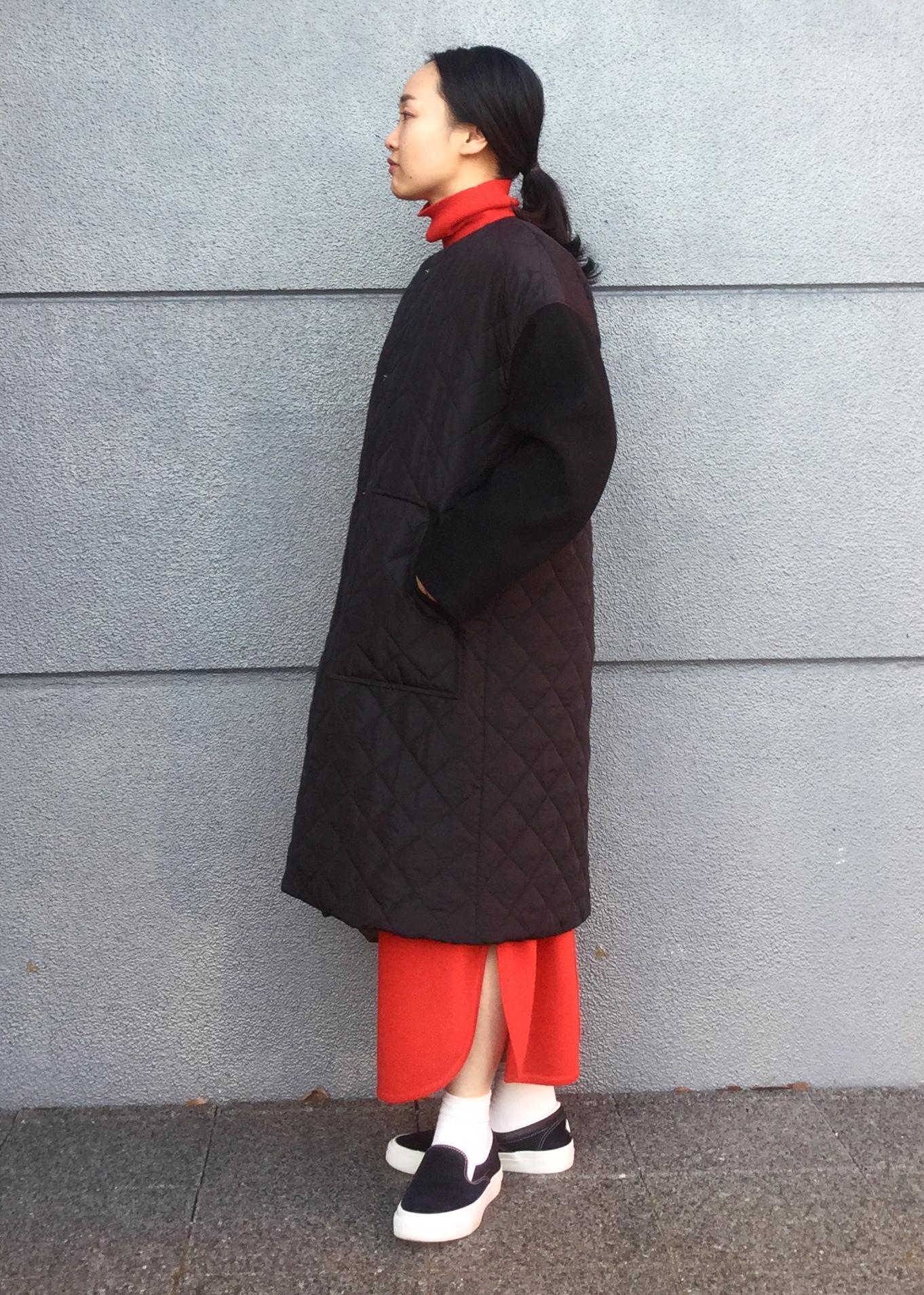 長めの丈感で暖かさもしっかりありつつ、軽い着心地はキルティングならではです。