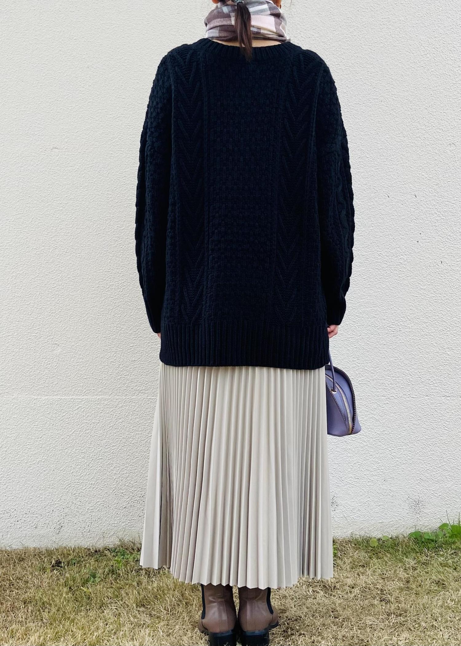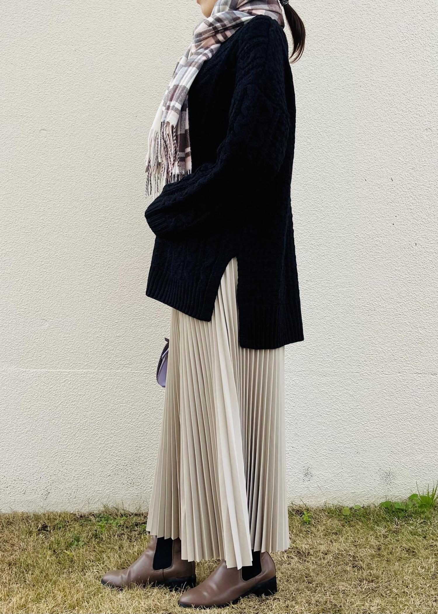 トップスとボトムは無地でまとめて、大柄のチェックのストールをコーデのアクセントにしました。レザーのプリーツスカートはウエストゴムでゆったりしているので着心地が楽です♪