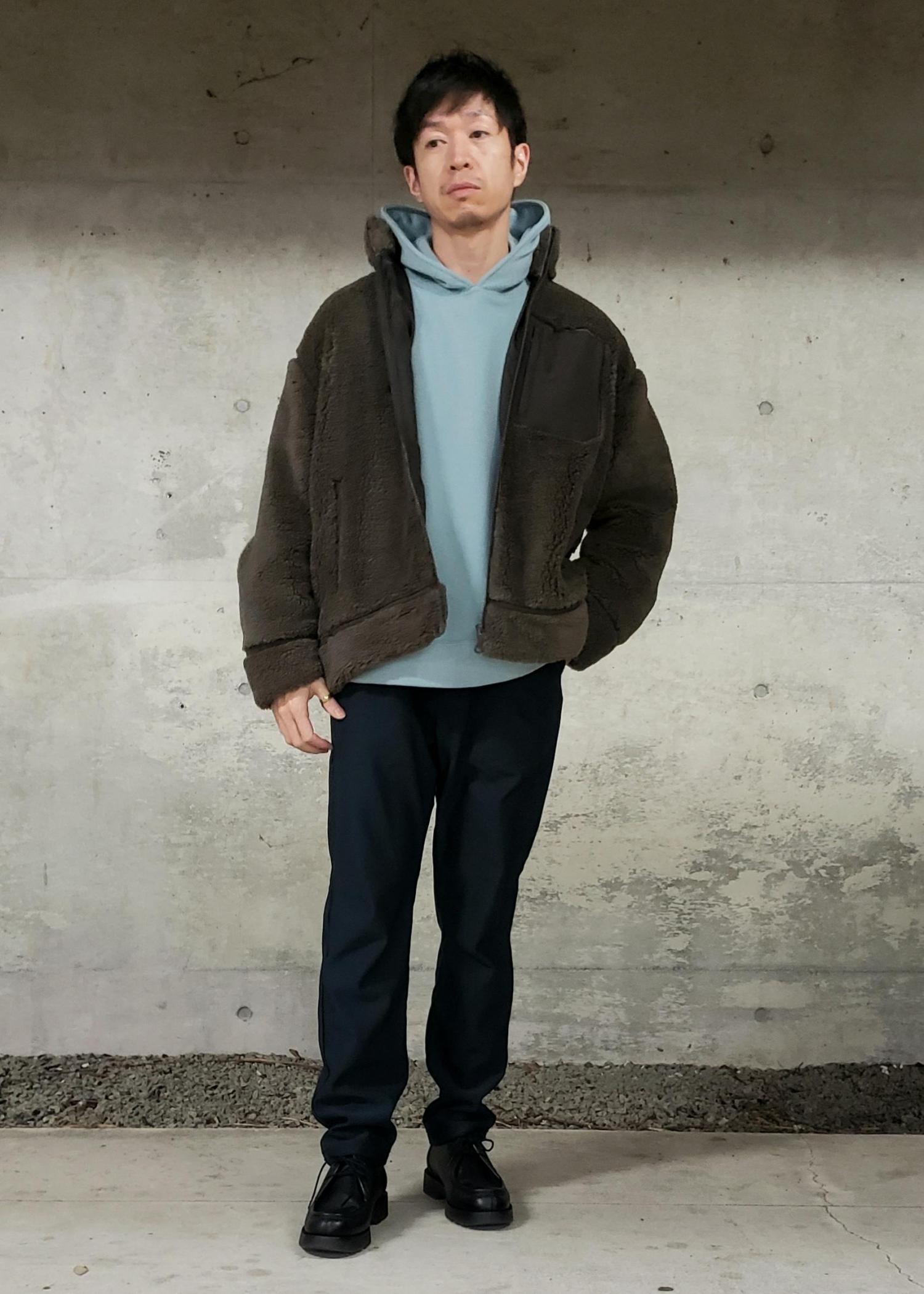 インナーに発色が良いパーカーをセレクトし重く見えないようにしています。ボアブルゾンの保温力は抜群で、ムートンアウターのようなパイピングが効いたデザインが秀逸。軽さと暖かさによりダウンの出番が減りそうです。