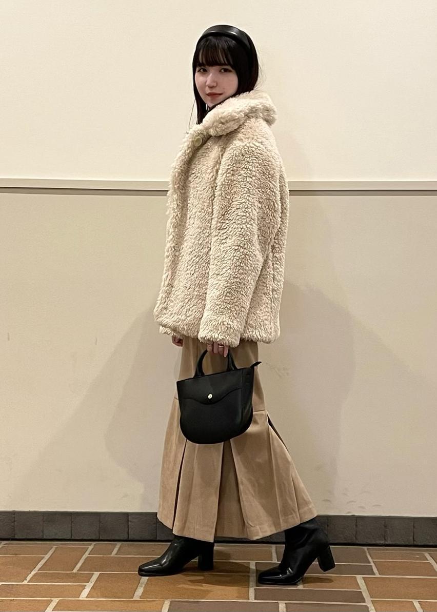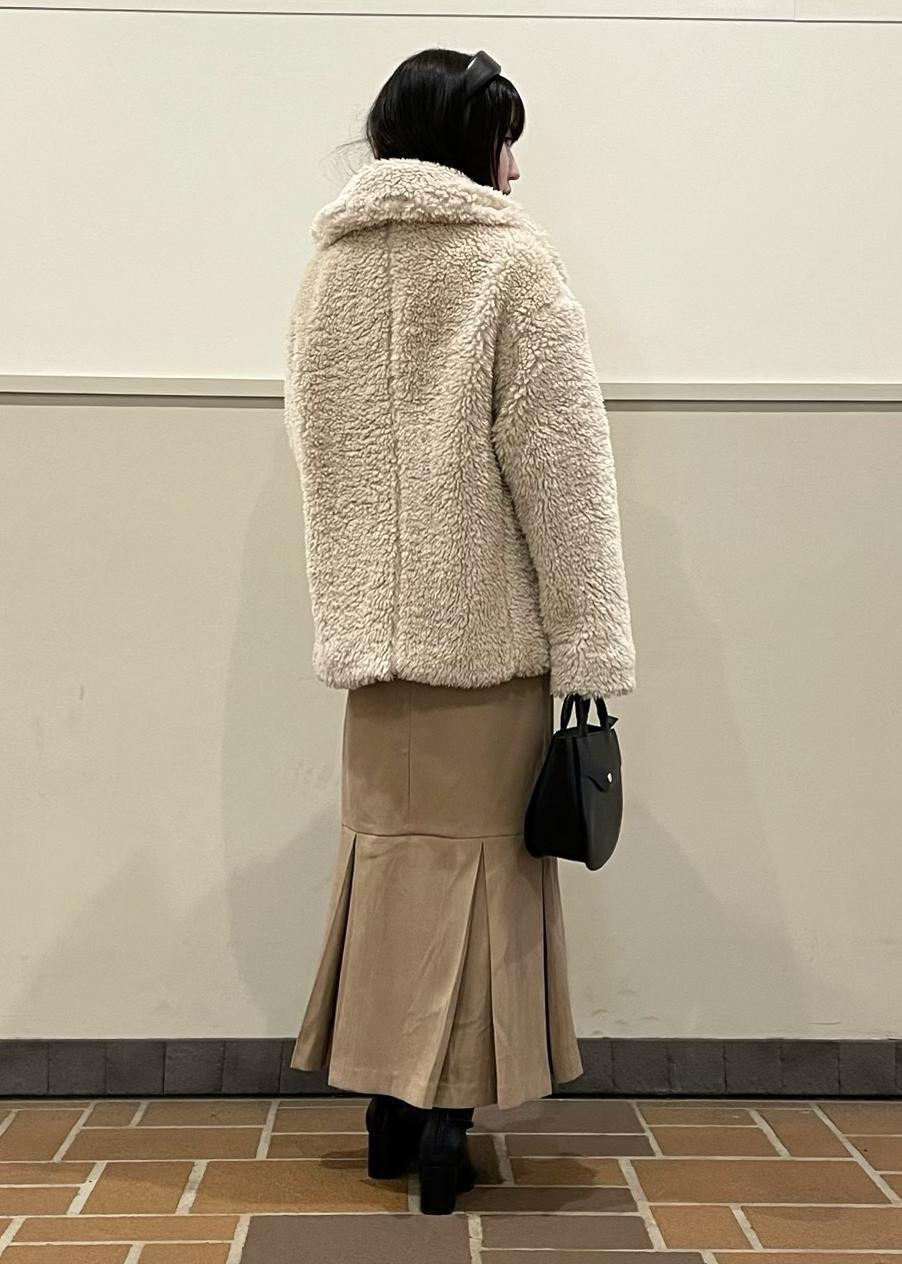 ふわふわもこもこのボアブルゾンに、やわらかい色味のニットとマーメイドスカートを合わせ、女性らしい可愛さを意識したコーデにしました!