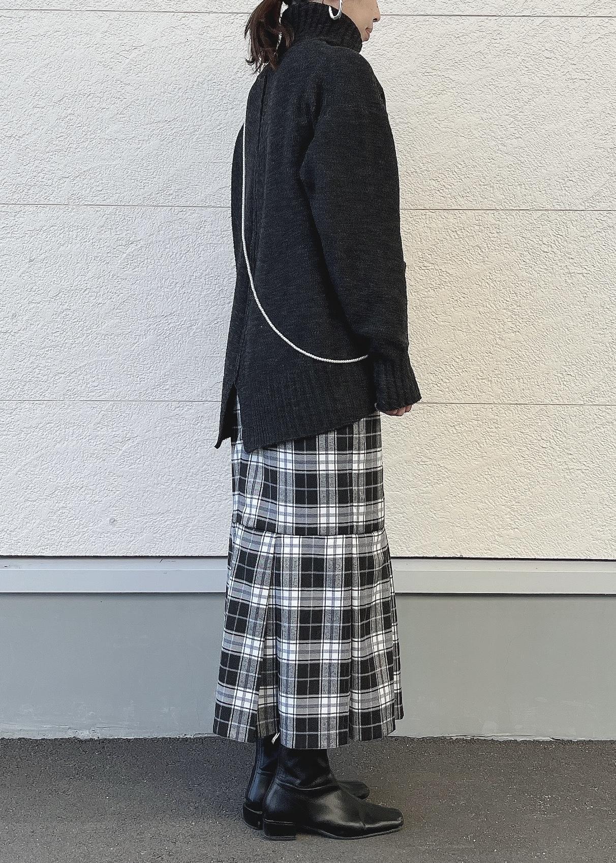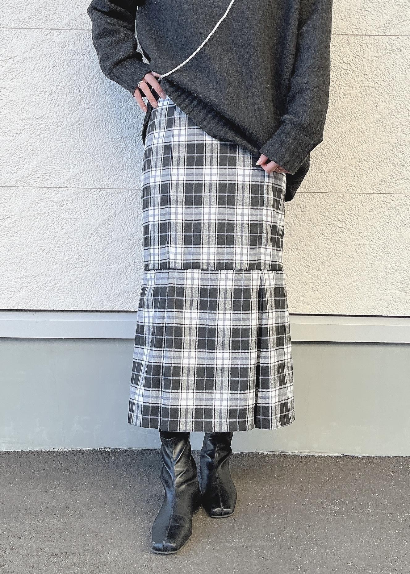 派手な印象のある大柄のチェックスカートを落ち着いた印象に纏めました。