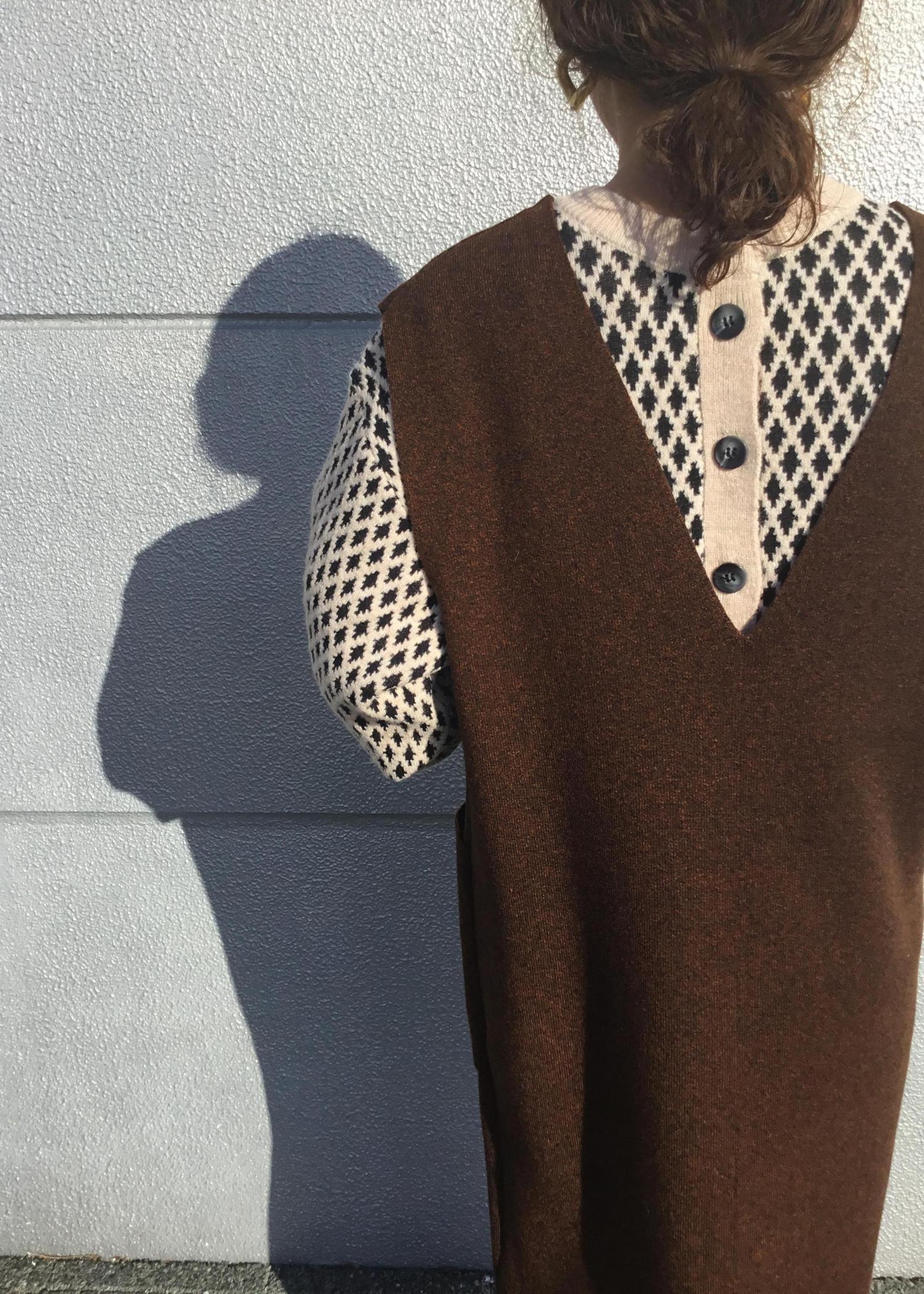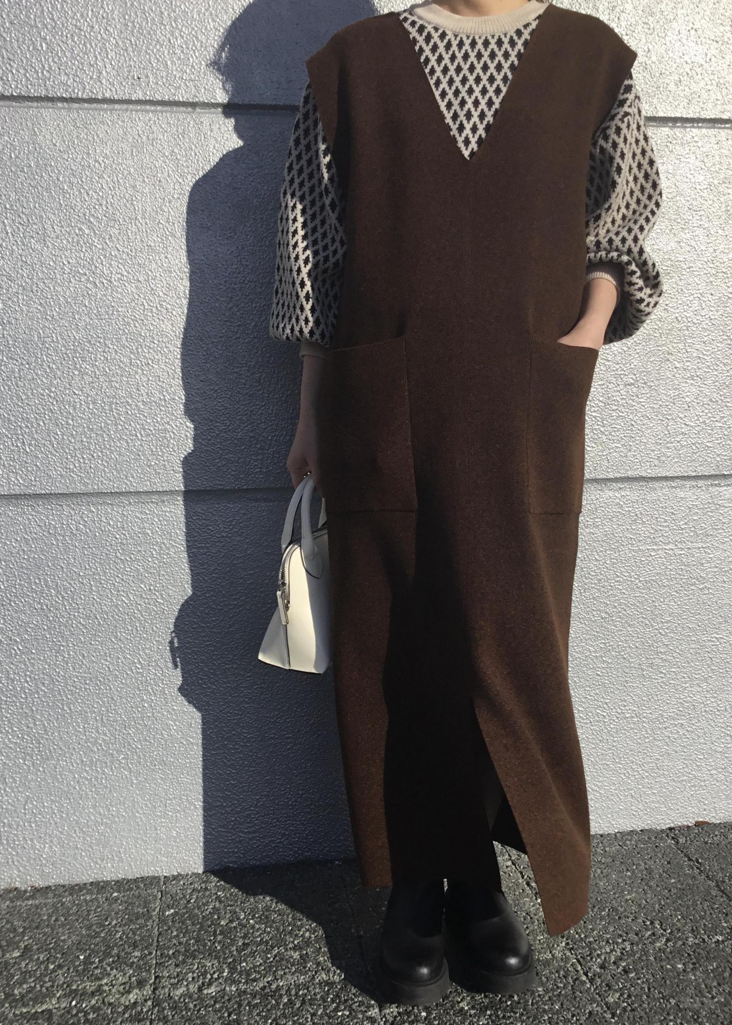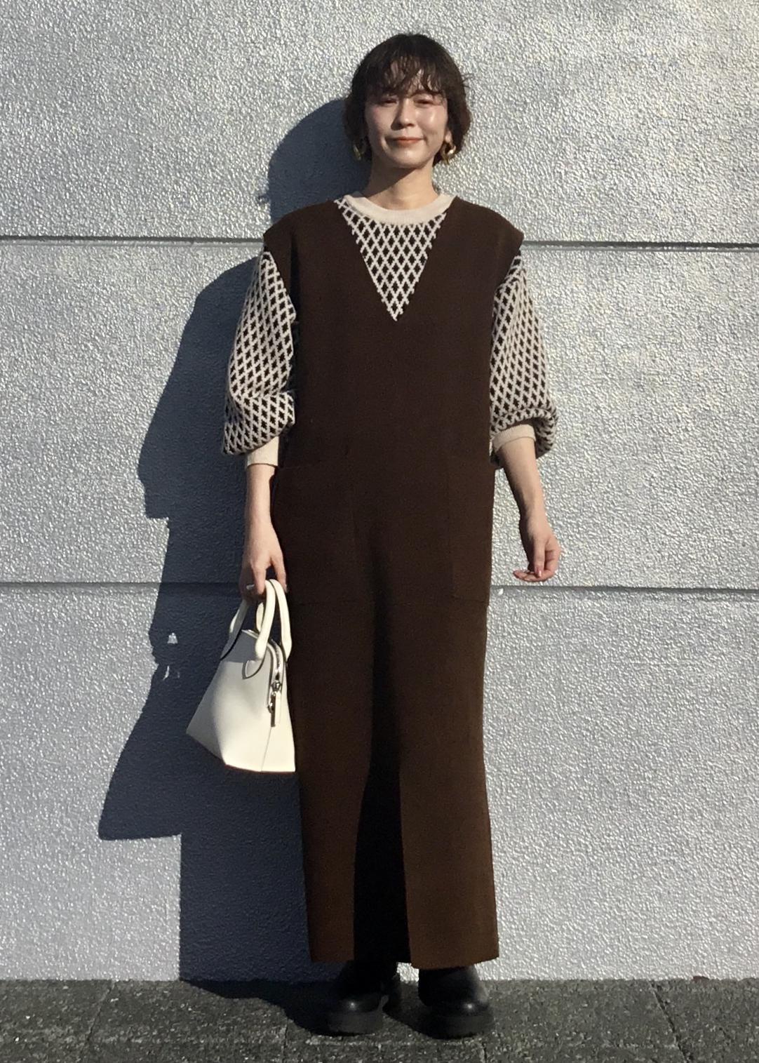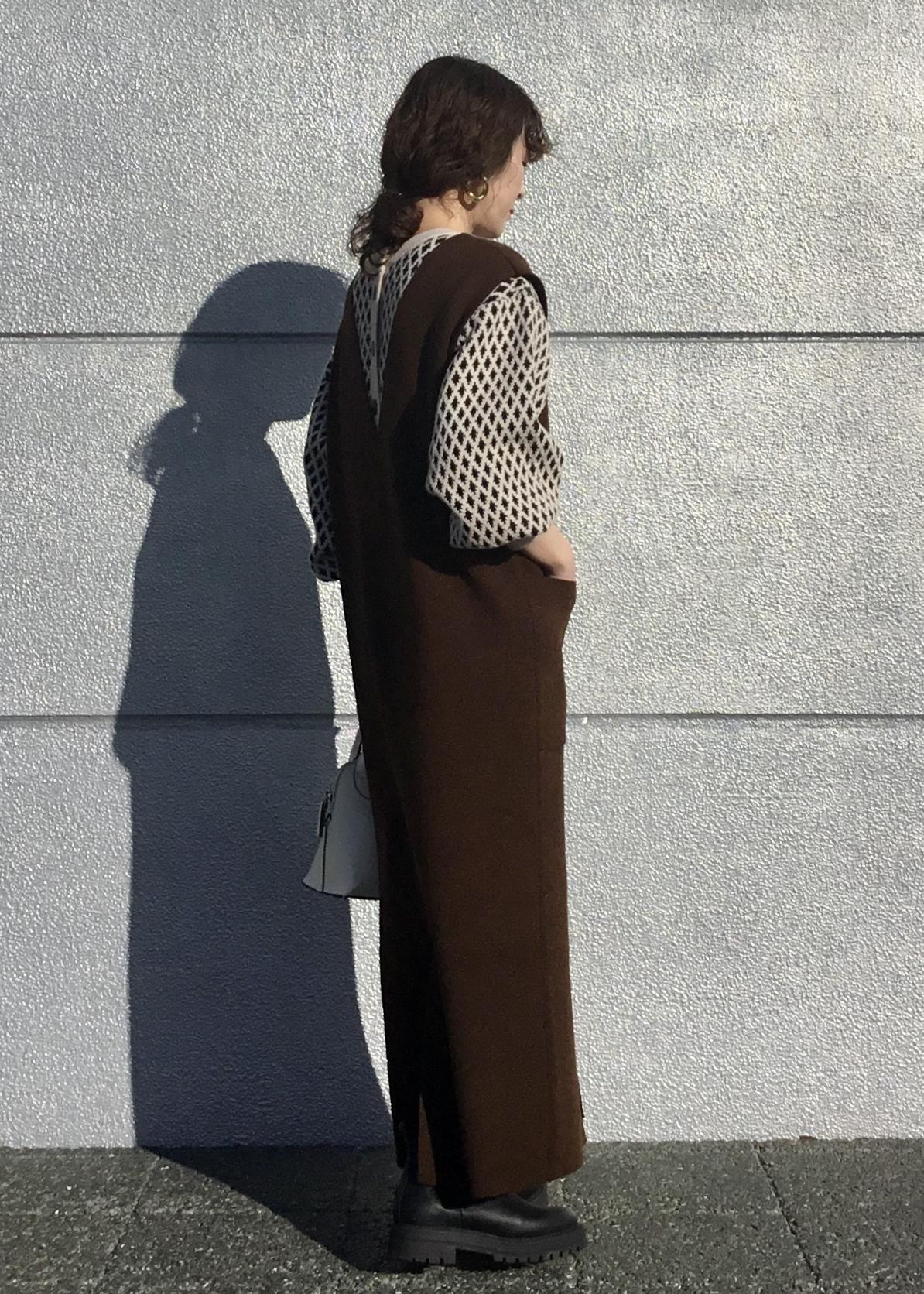 目の詰まったニット素材ですが、ウールが含まれていない為、シーズンレスで着用でき、ご自宅でお洗濯可能なイージーケア素材なのもうれしいポイントです◎
