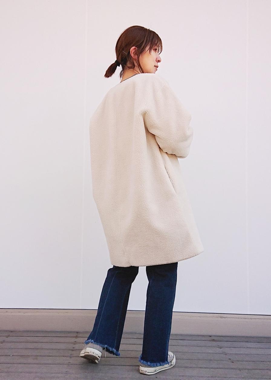 パイピングがポイントのホワイトのアウターに、淡いカラーのニットを合わせたカジュアルスタイルです。 淡いニットには白いカットソーをレイヤードして、めりはりをつけました。