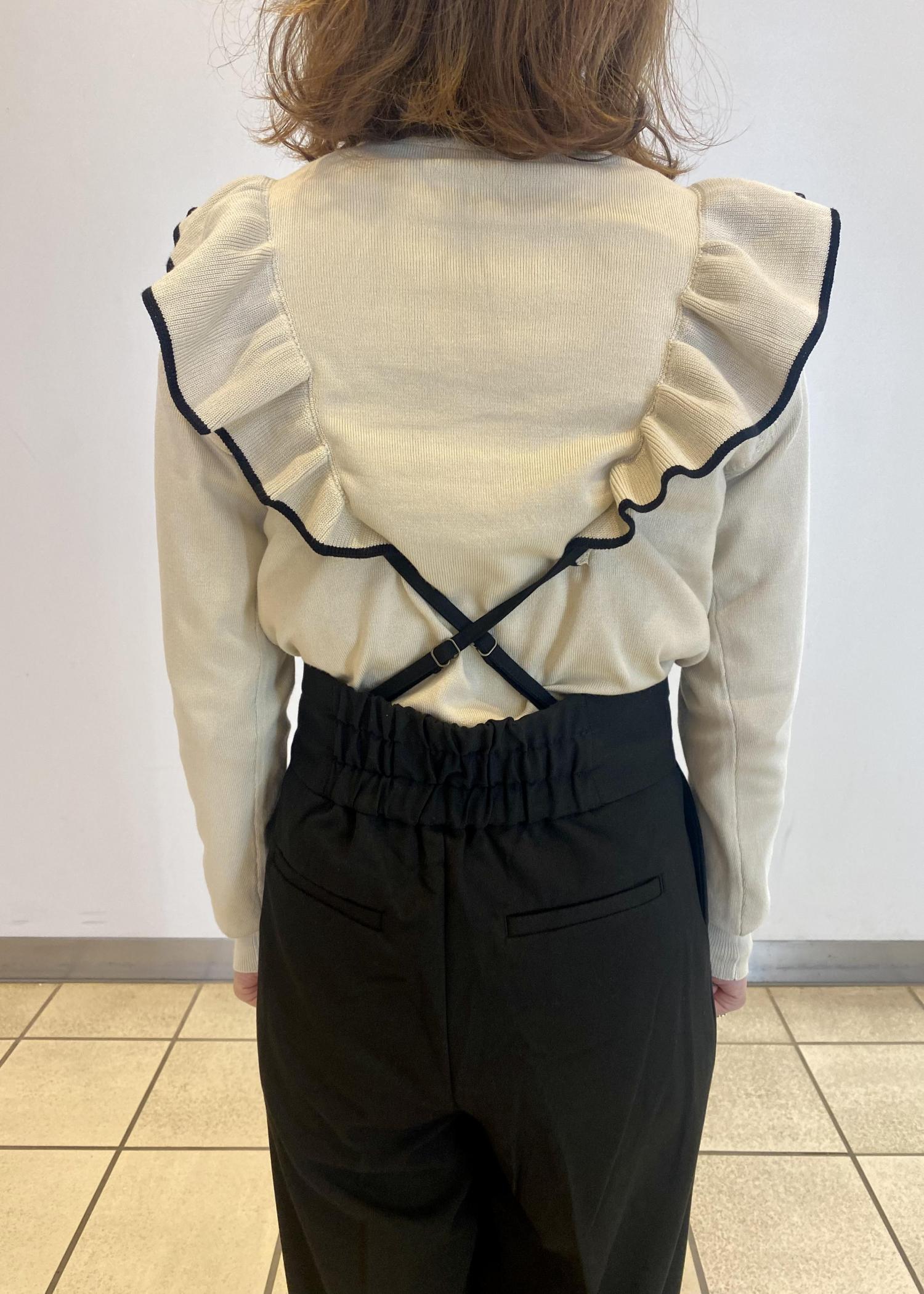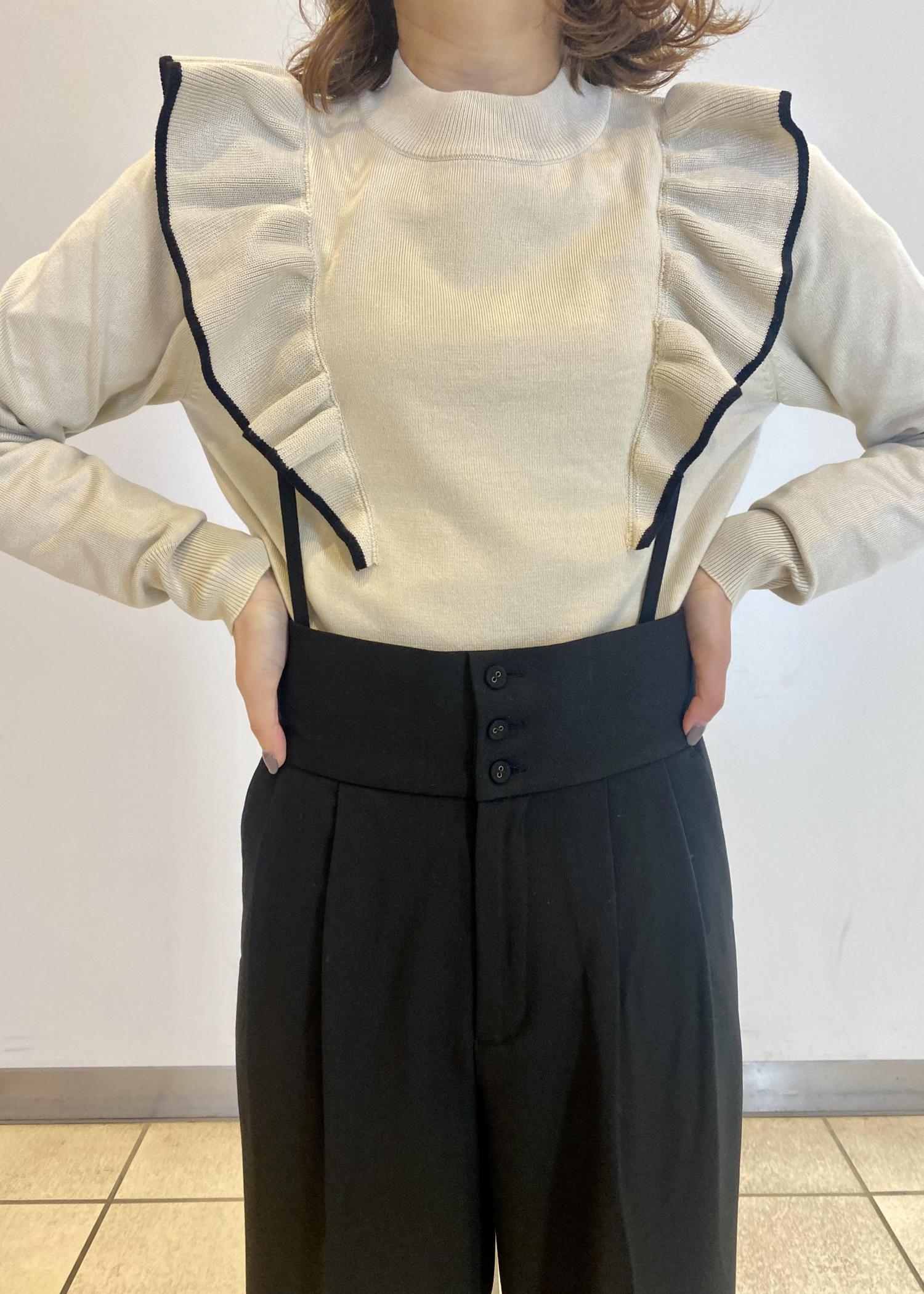 フリルニットは甘くなりがちなアイテムです。 とっても可愛いですが、さらっと着たいです、私は。。。 ベーシックなカラーで甘さを抑え、パンツ合わせにする事で、 華やかさはあるが、かっこいい印象になります◎