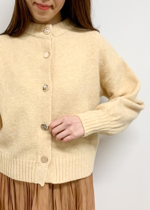 カーディガンはウール混で暖かくふわふわの生地でとても着心地がよいです。ボタンが全て違うデザインで、ネックレスを付けなくても華やかに見せてくれます。 丈が短めなので大人気のシャイニースカートにインしなくてもバランスよく着れます。同系色でまとめて統一感をだしてみました。