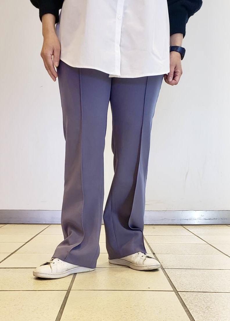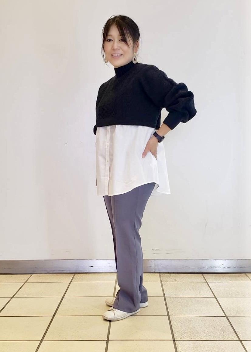 レイヤード風のニットで、簡単にコーデが決まります。 差し色として下にパープルのカラーパンツを合わせました。