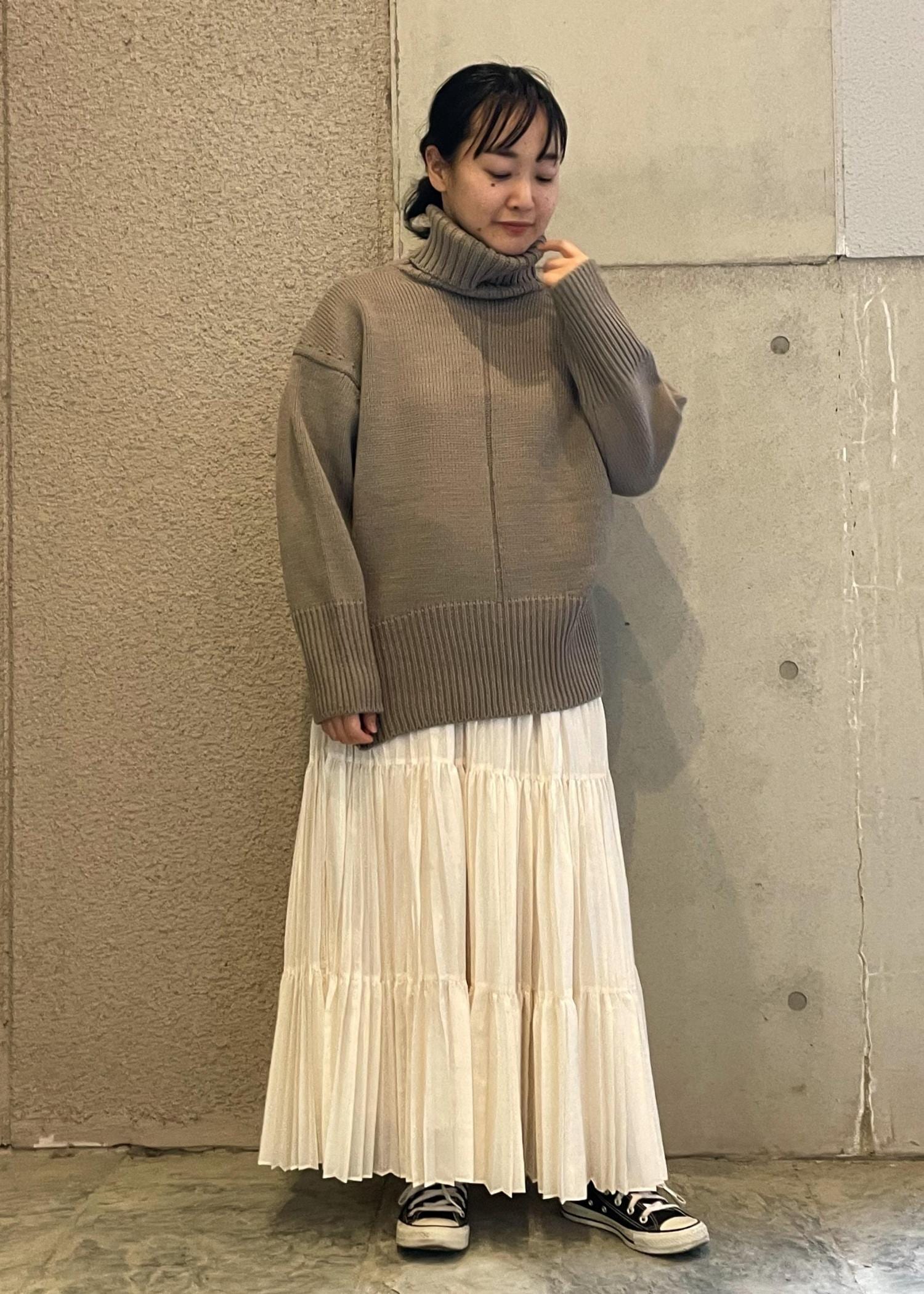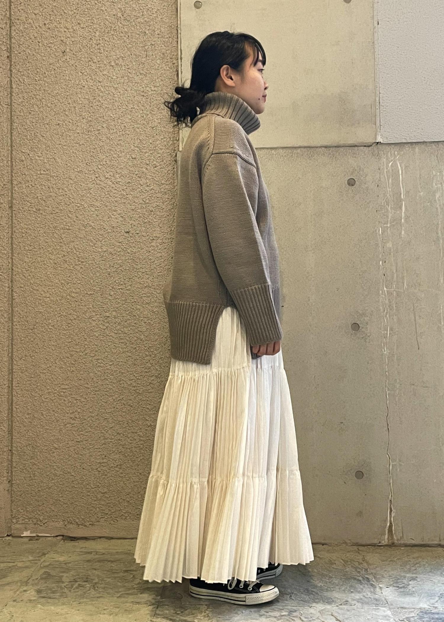 まだまだ寒さの続く時期に、合わせやすいローゲージのタートルニット。