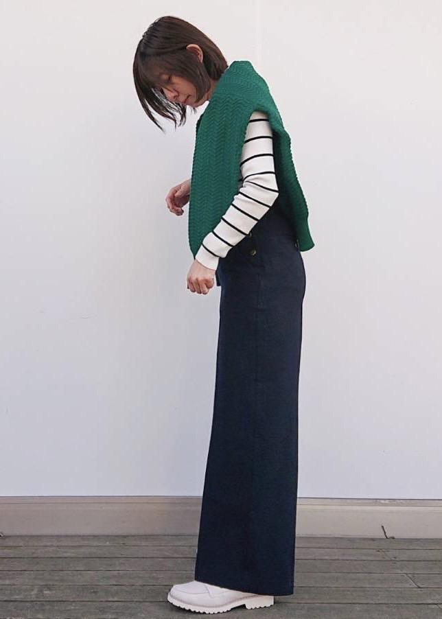 鮮やかなグリーンのカーディガンを肩から掛けて差し色にしました。