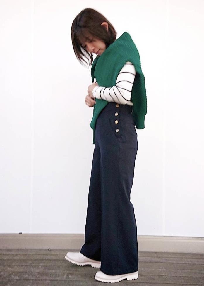 ボーダーのトップスに、金ボタンがポイントのパンツを合わせたマリンスタイルです。