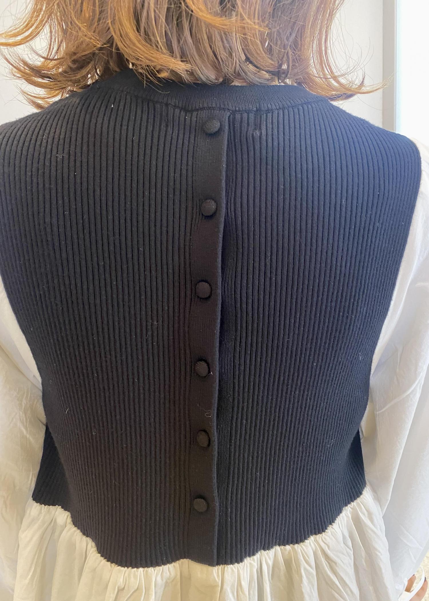 カラーをモノトーンに抑え、ボトムにニットパンツを合わせると