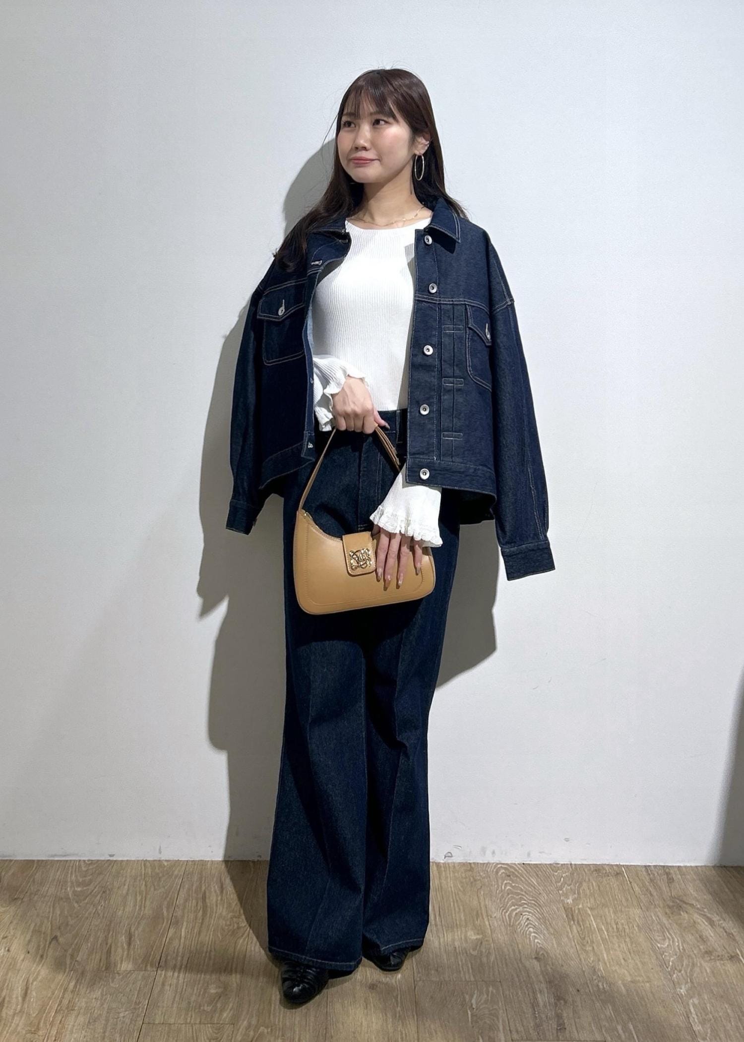 肩フリルがとっても可愛いトップスにアイスブルーのスカートを組み合わせたフェミニンなstylingは春の装いを感じますね☆ カジュアルに着用する際はデニムと合わせるのがオススメですよ◎