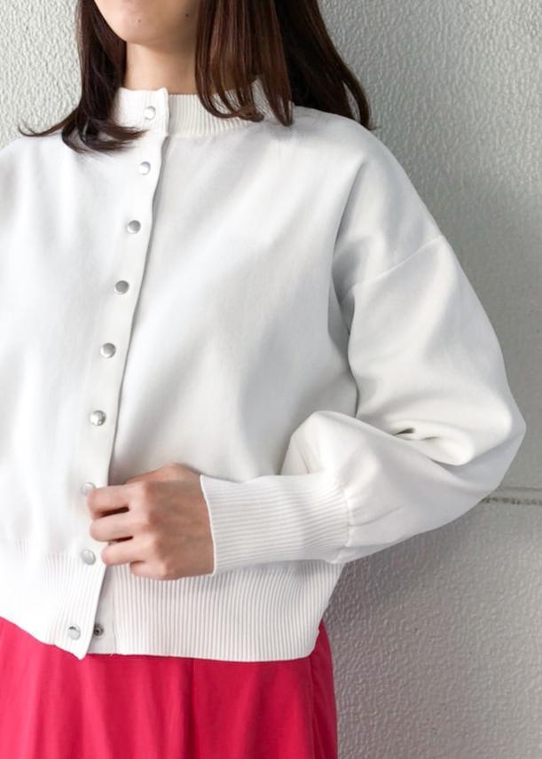 少し赤に近いビビットピンクのスカートは存在感があるので、シンプルな白のカーディガンを合わせました。