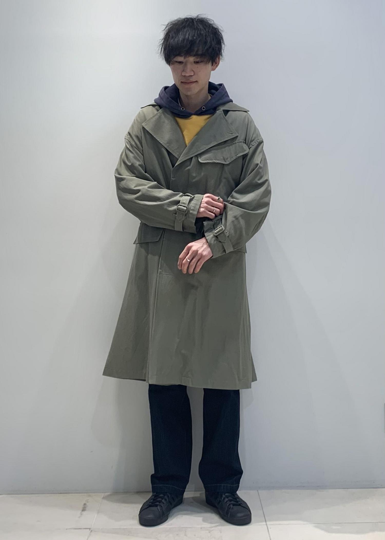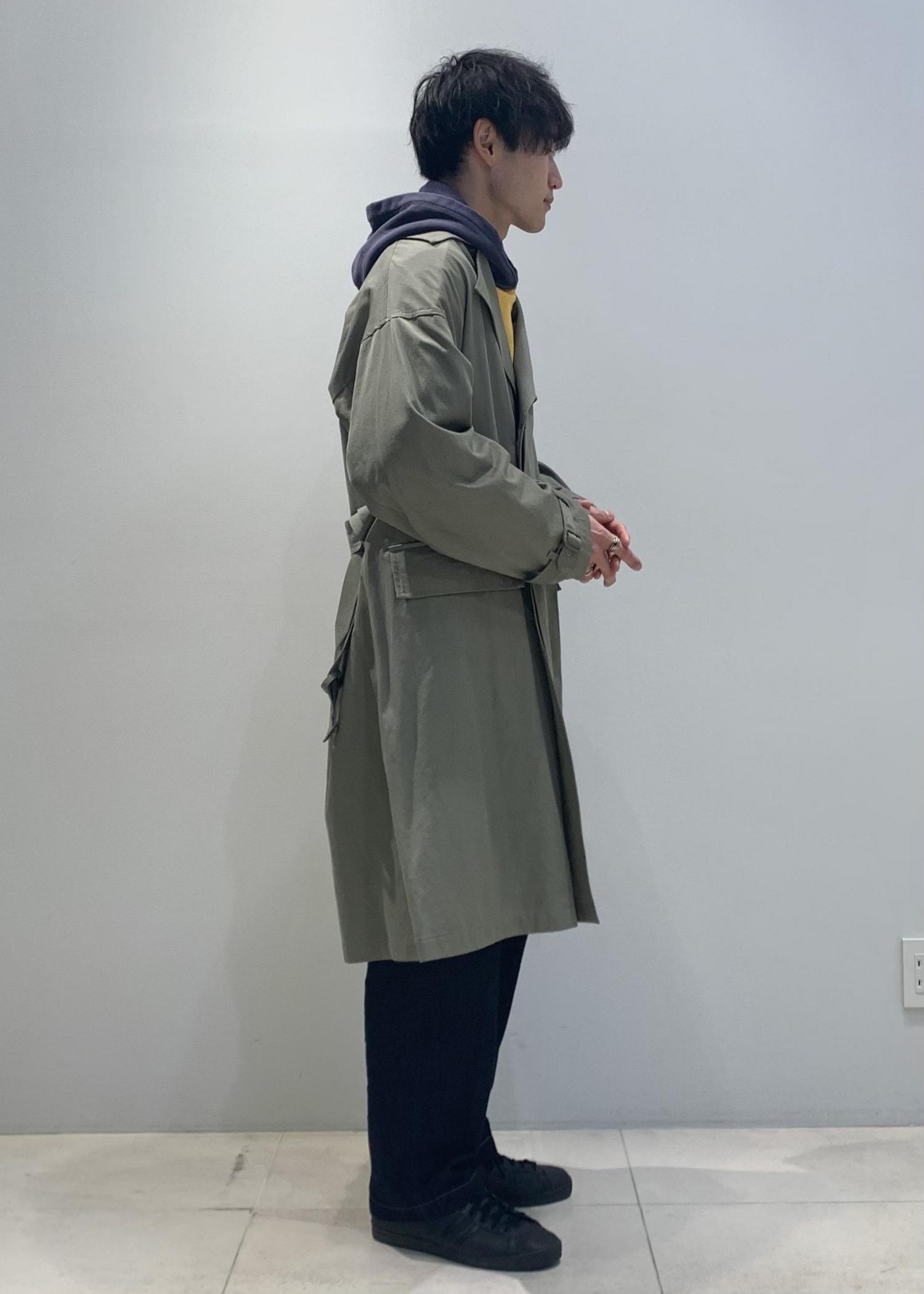 たっぷりと分量を取ったダブルブレストコートの為、バサッと羽織りフロントを開けた着こなしや、衿を立てて配色の別布を見せたコーデもオススメです。