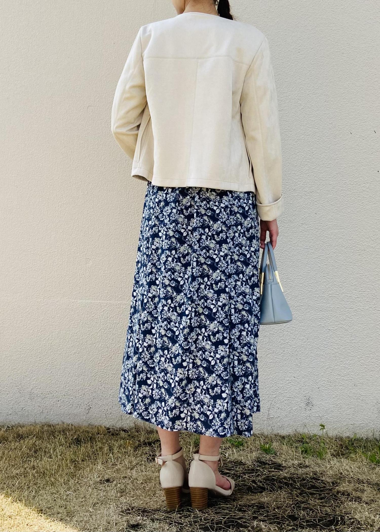 春らしいコーデになるように花柄ワンピースにスエードのブルゾンを羽織りました。足元はサンダルにして涼しい印象にしました。ブルゾンはリサイクルポリエステルを使用した、環境に優しいアイテムとなっております!