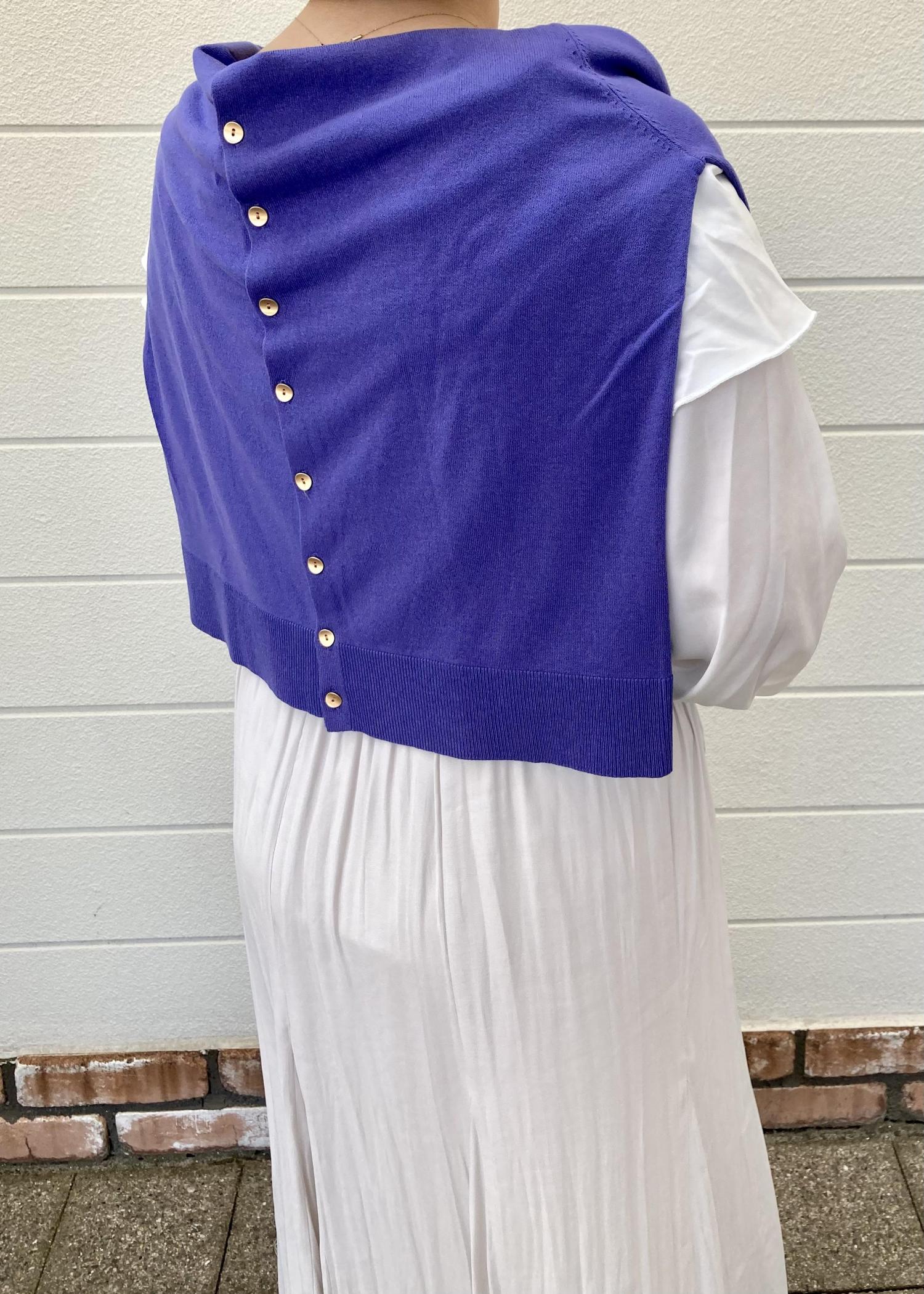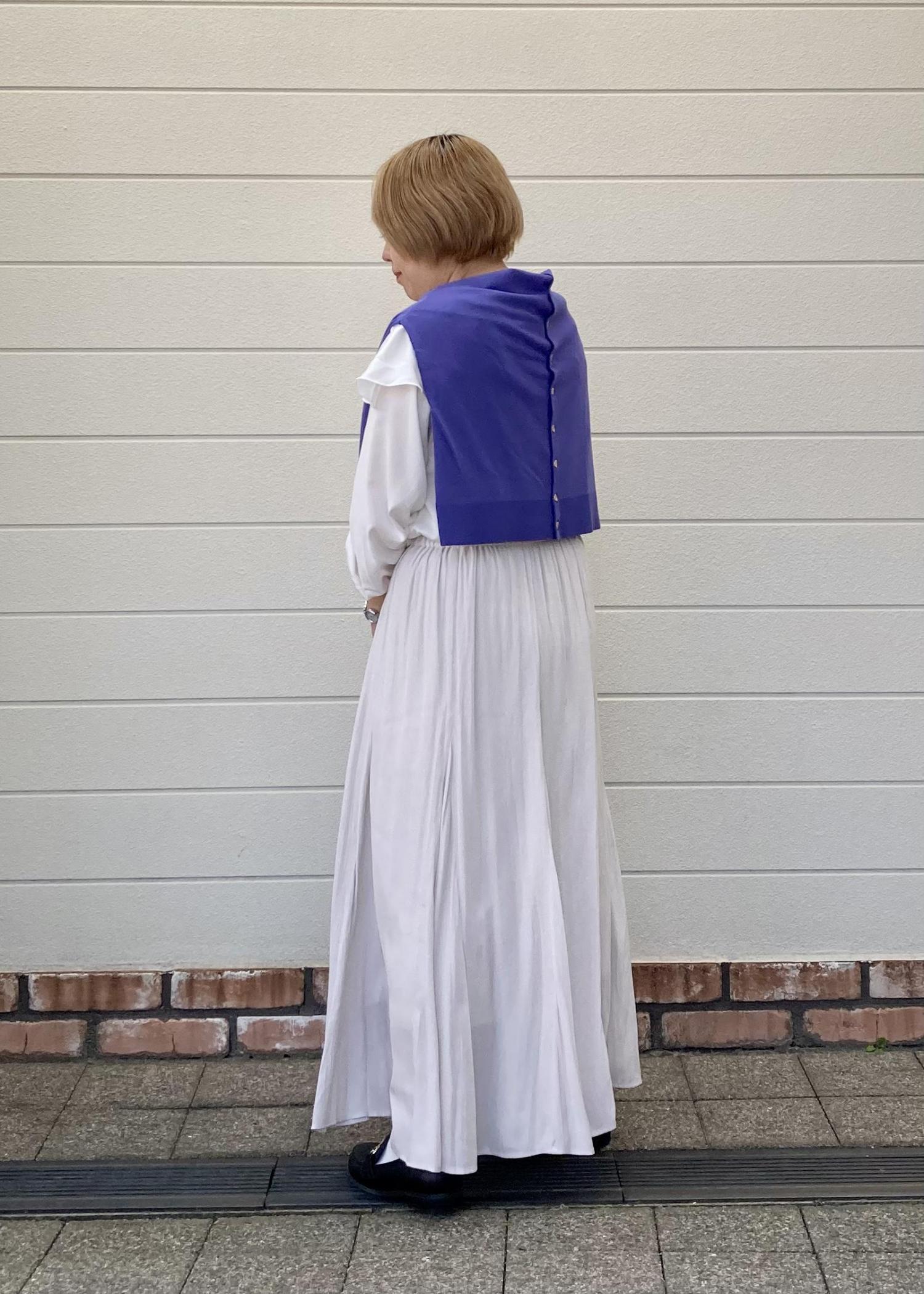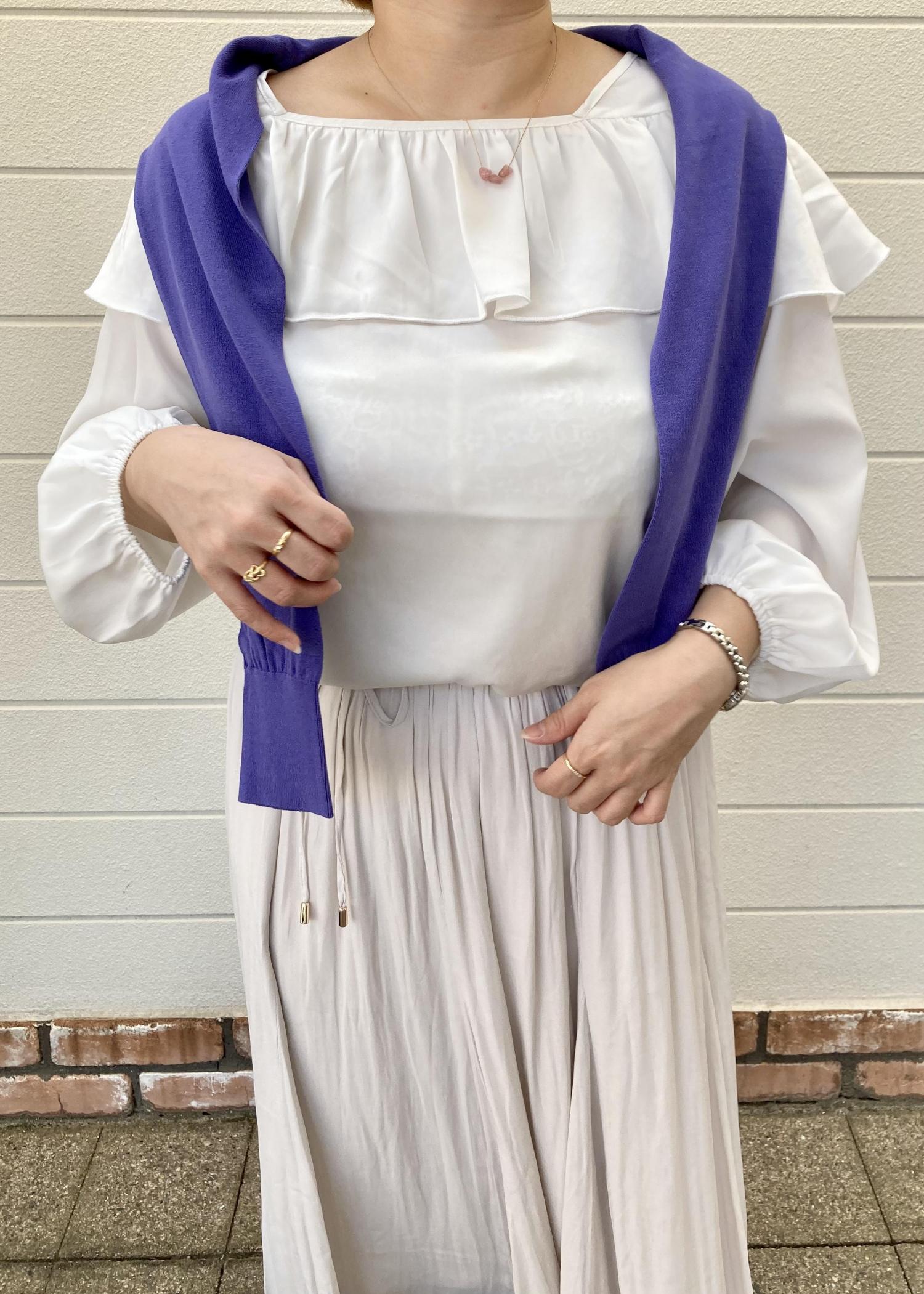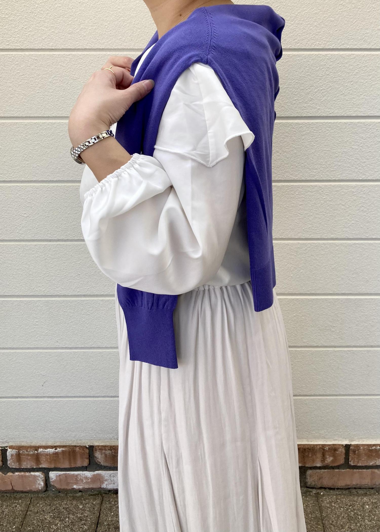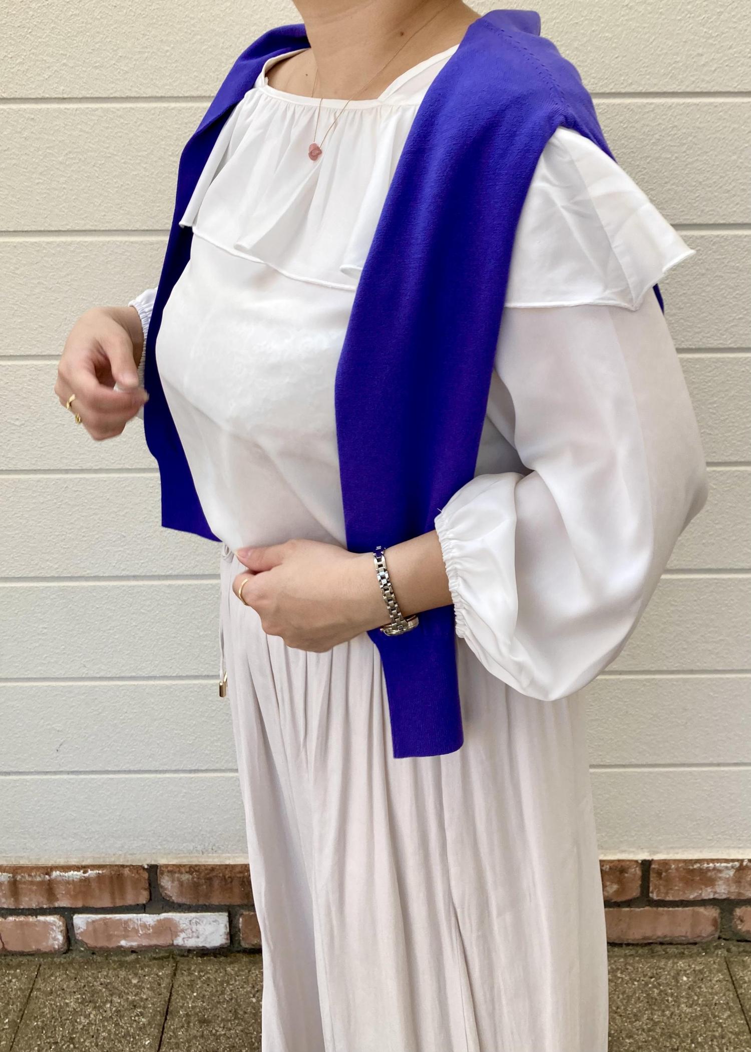 鮮やかなパープルのカーディガンを肩がけで差し色に。日除けで羽織りとしても◎