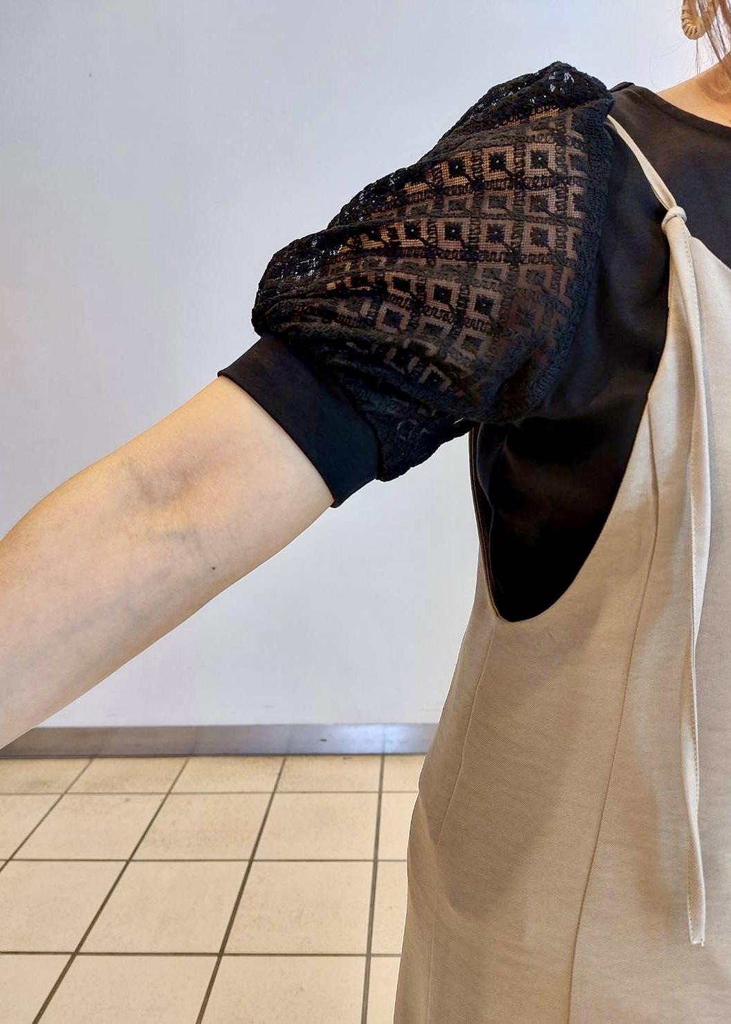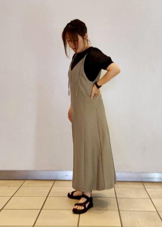 袖に透け感のある涼しげなトップスにワンピースを合わせ、女子会にもデートにも使えそうなきれい目なコーデに仕上げました。