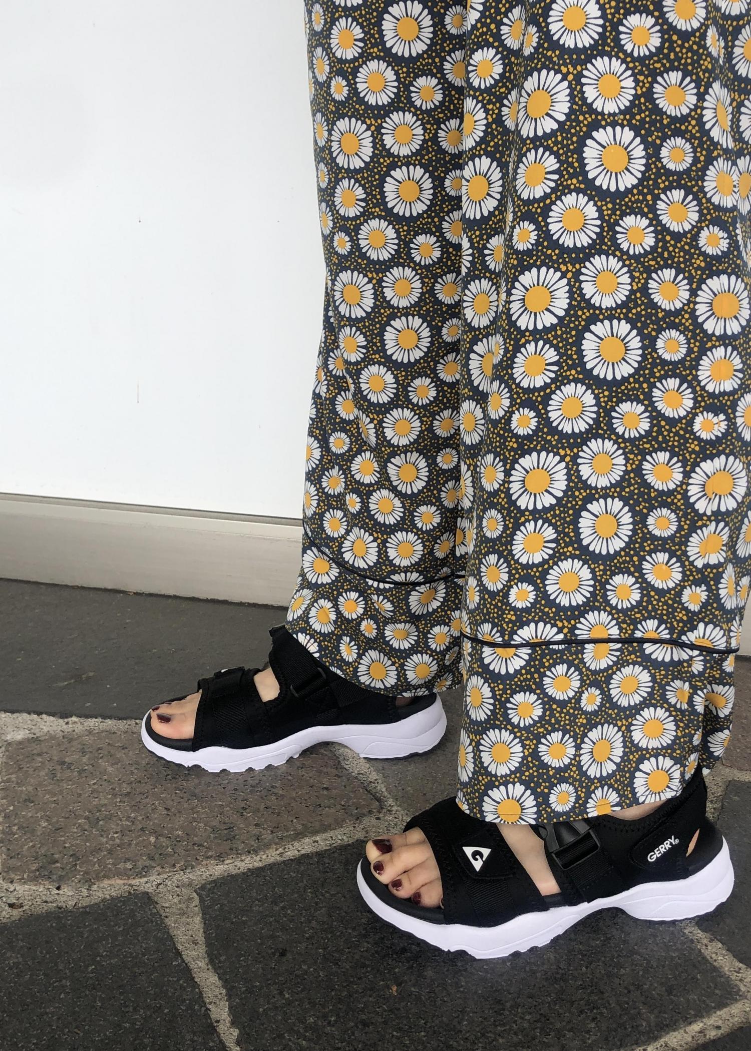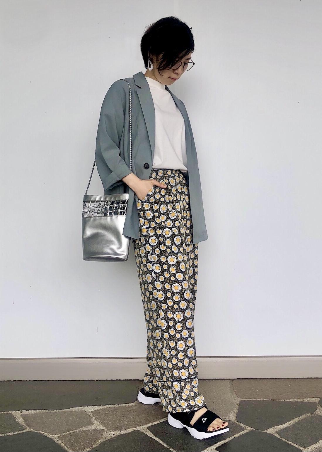 色や柄の主張が強くなりすぎないよう、トップスやサンダルに白を足して軽さを出しました。