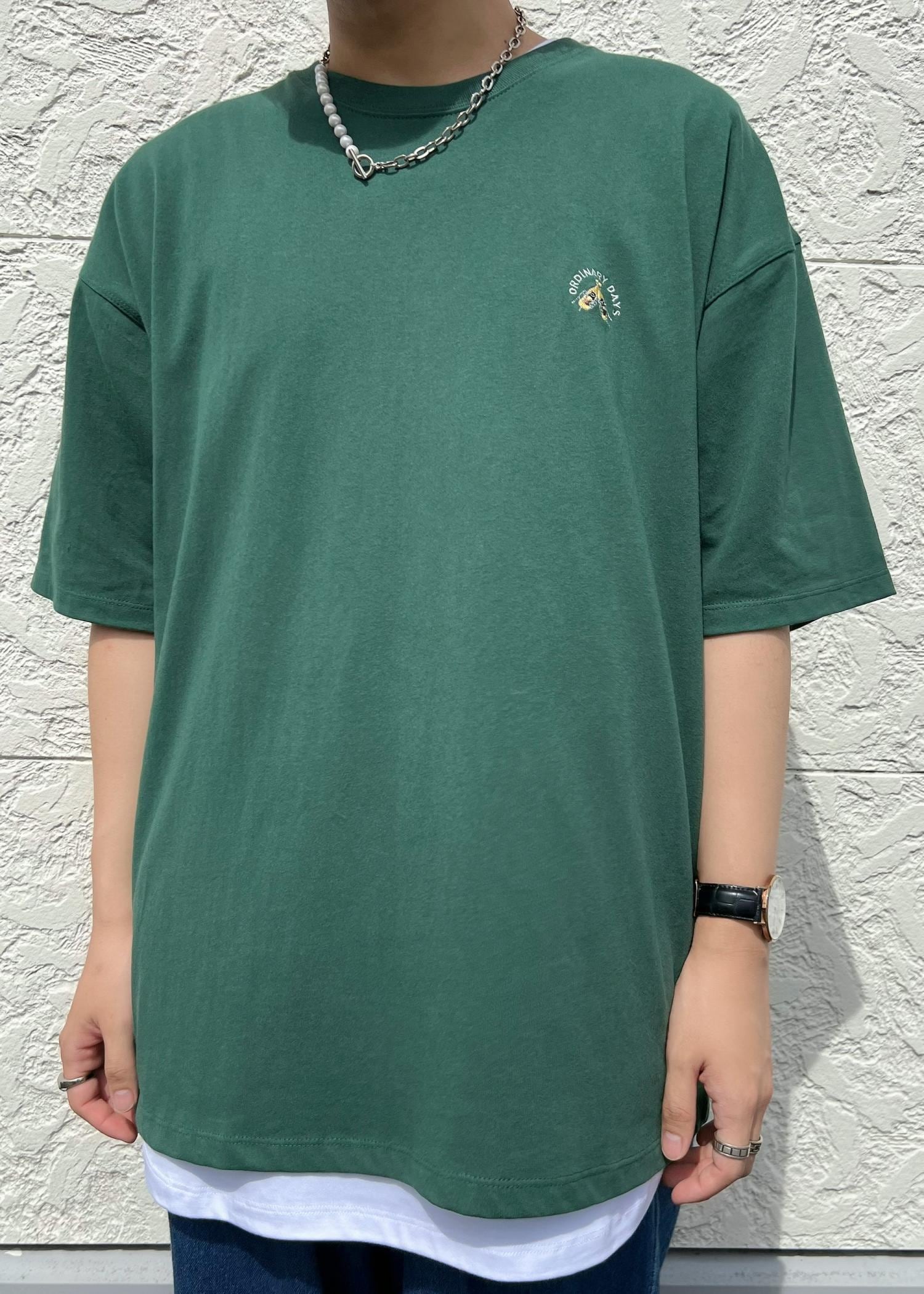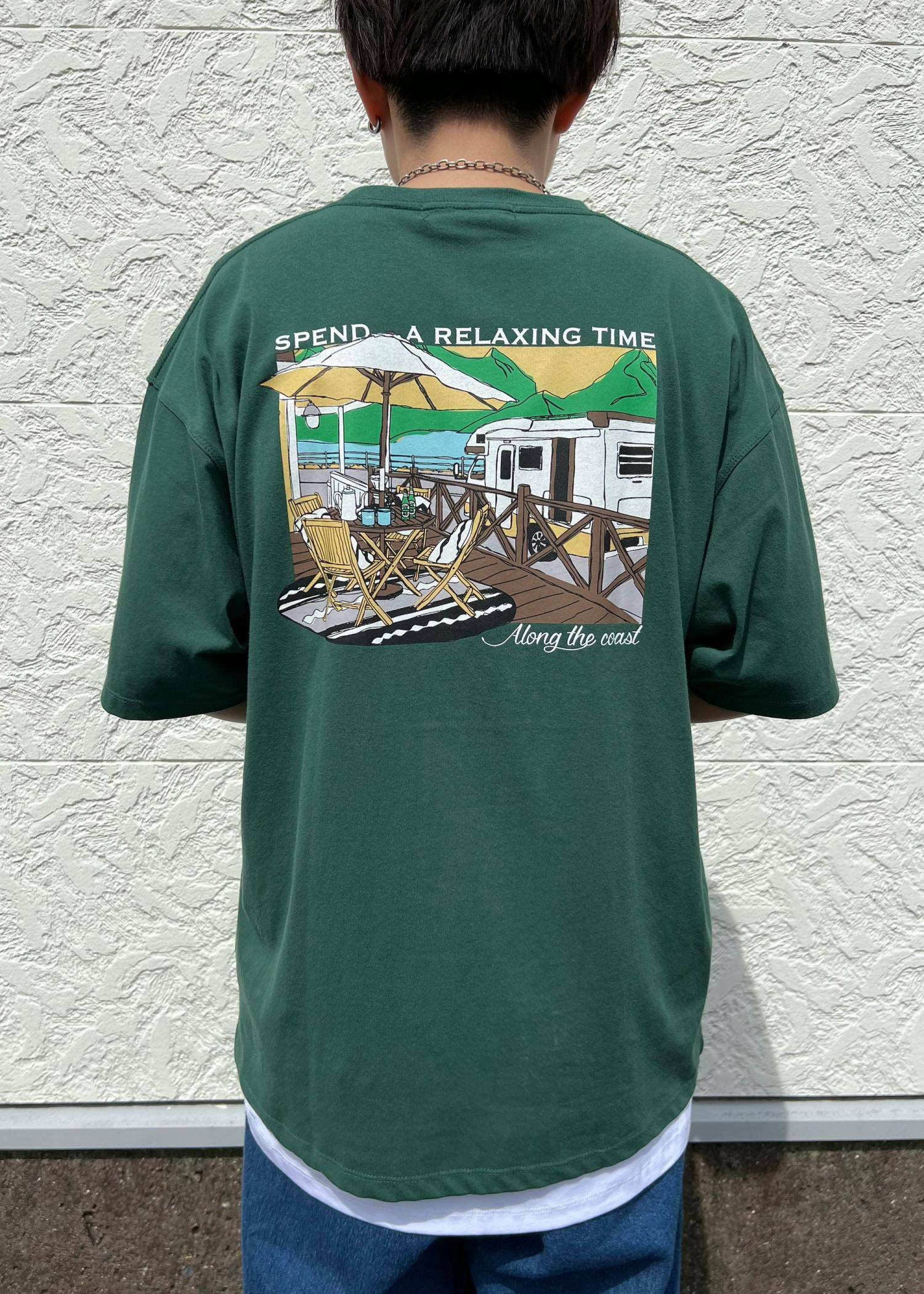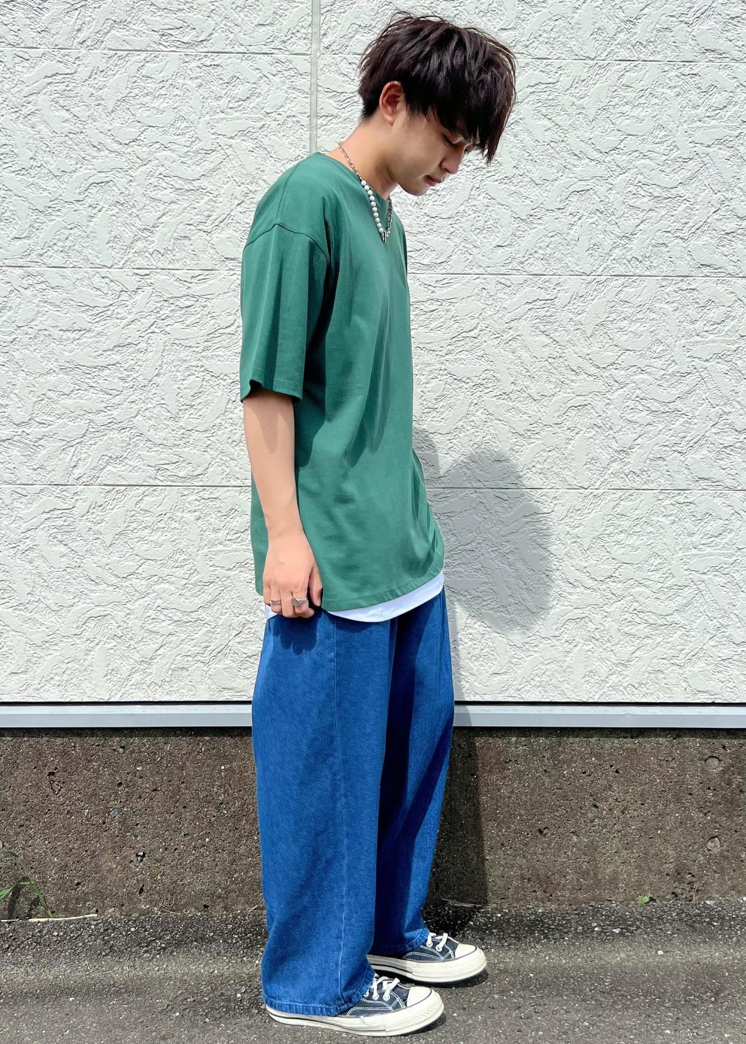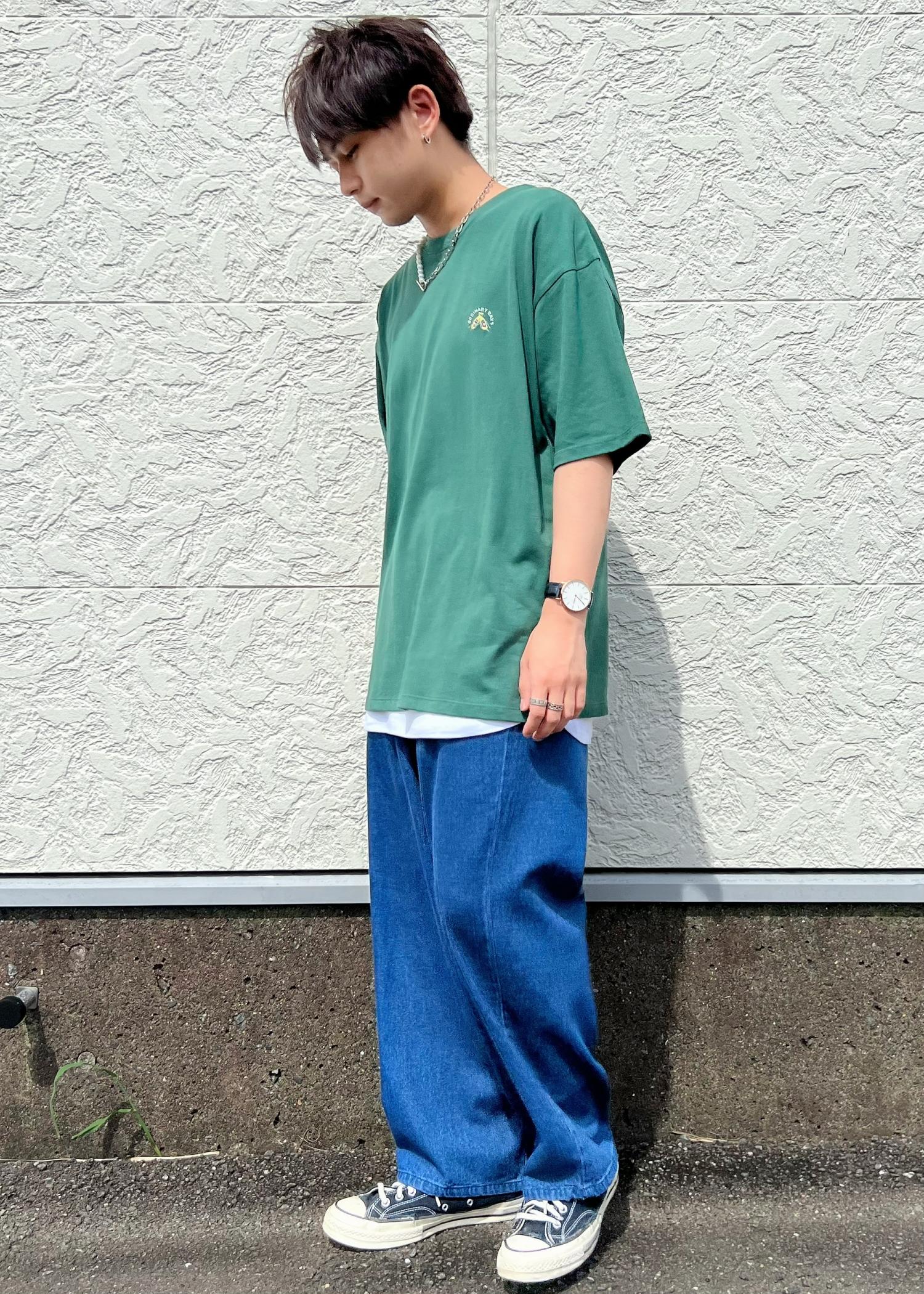 ライフスタイルTシャツを使ったコーデ。インパクトのあるカジュアル感の強いTシャツですのでワイドデニムと合わせ、ストリートっぽく古着チックなスタイリングにしてみました。