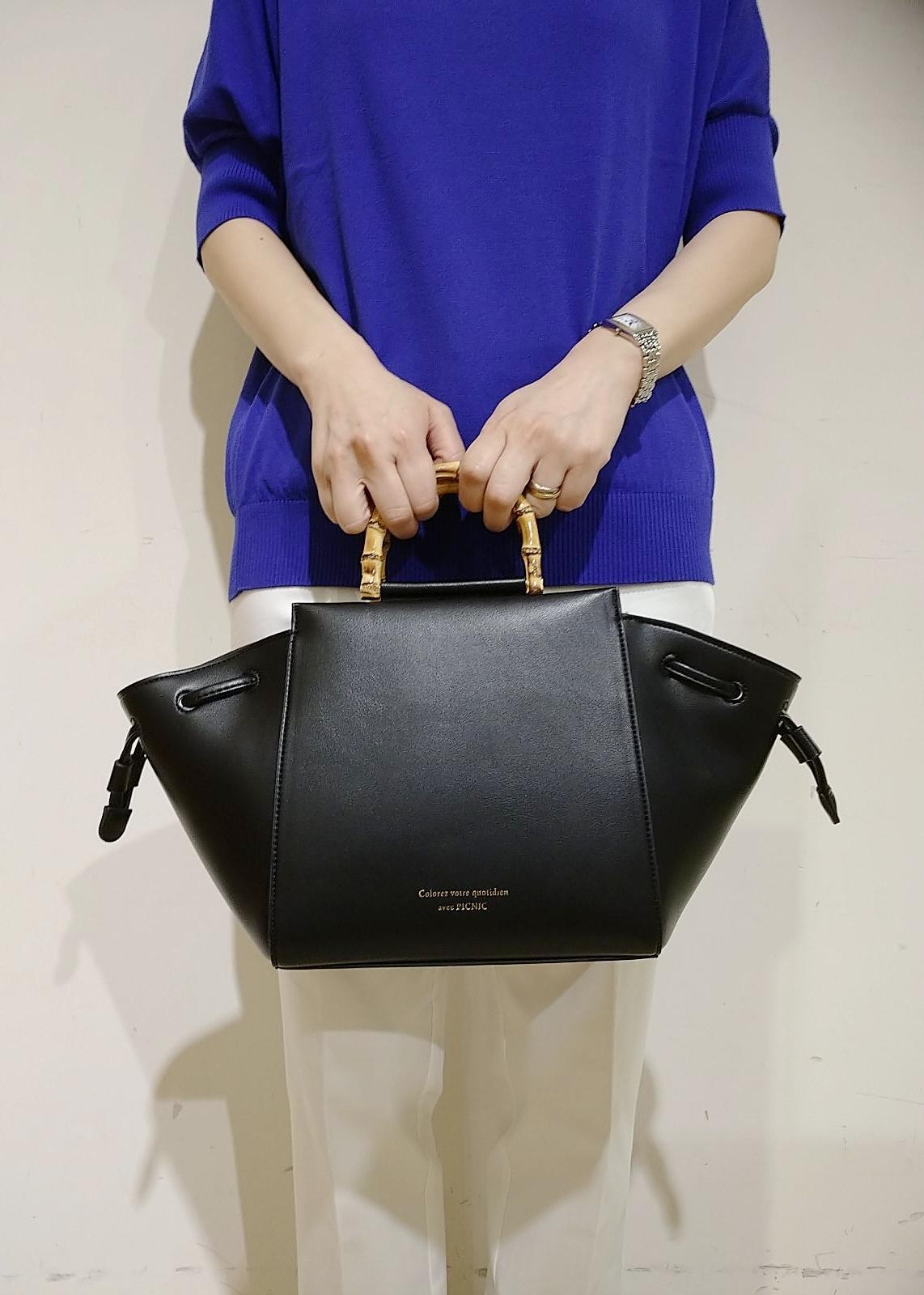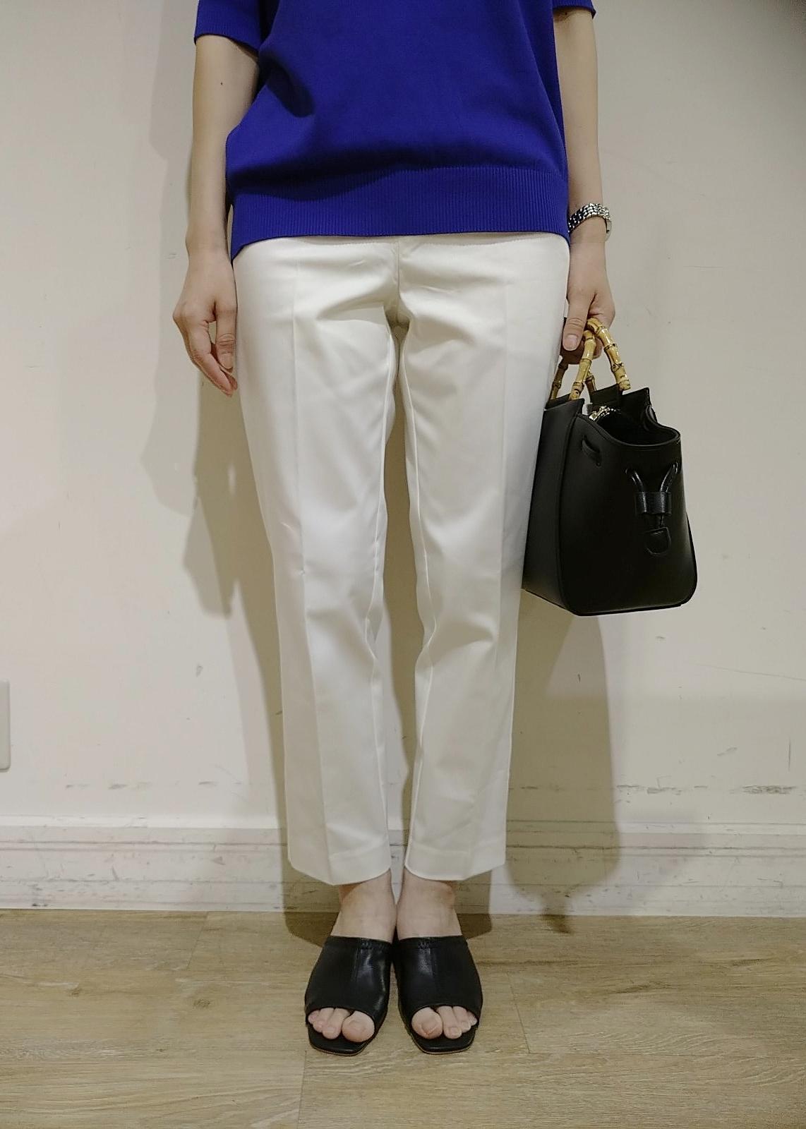 綺麗なブルーのコットンドルマンニットを白のパンツで合わせました。汚れやすい白のパンツですが防予加工してあるのでおすすめです。