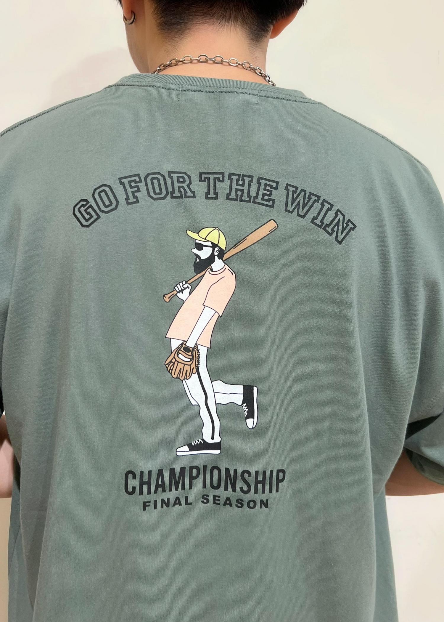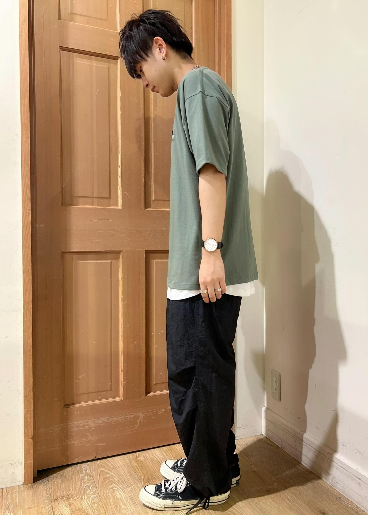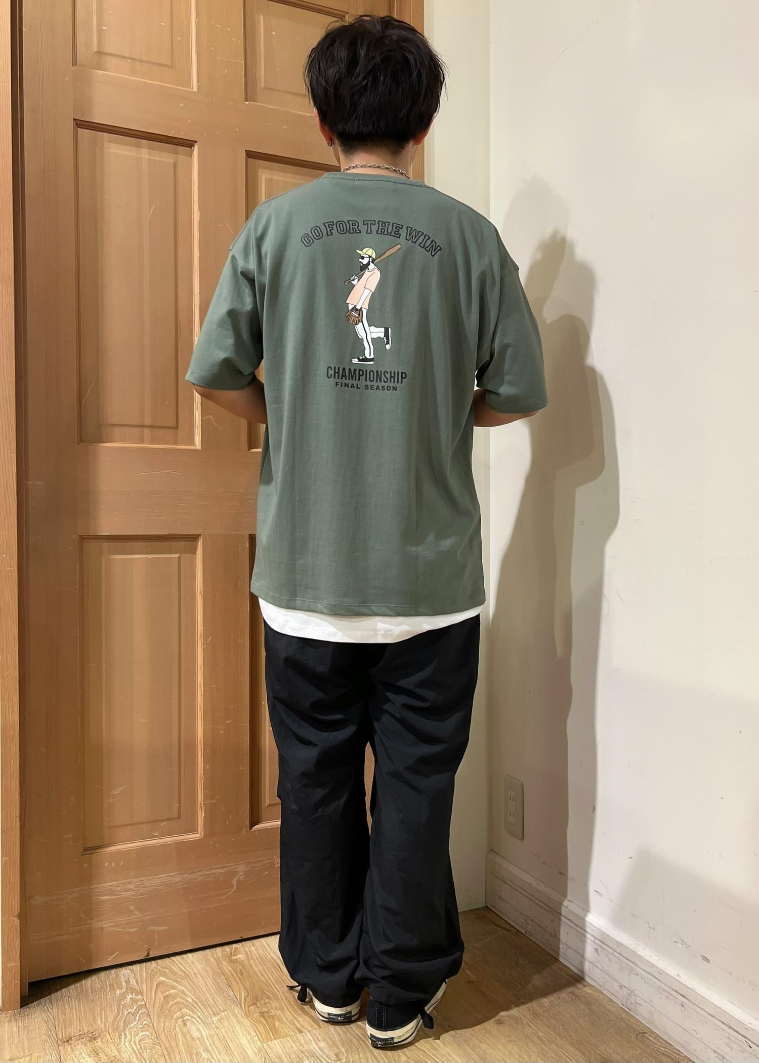 ヒゲおじさん1ポイントTシャツを使ったコーデ。シャリ感の強いワイドパンツと合わせ、ストリート感の強いコーデにしてみました。大きすぎないサイズ感ですので、シンプルにデニムなどと合わせたベーシックなスタイリングもおすすめです。