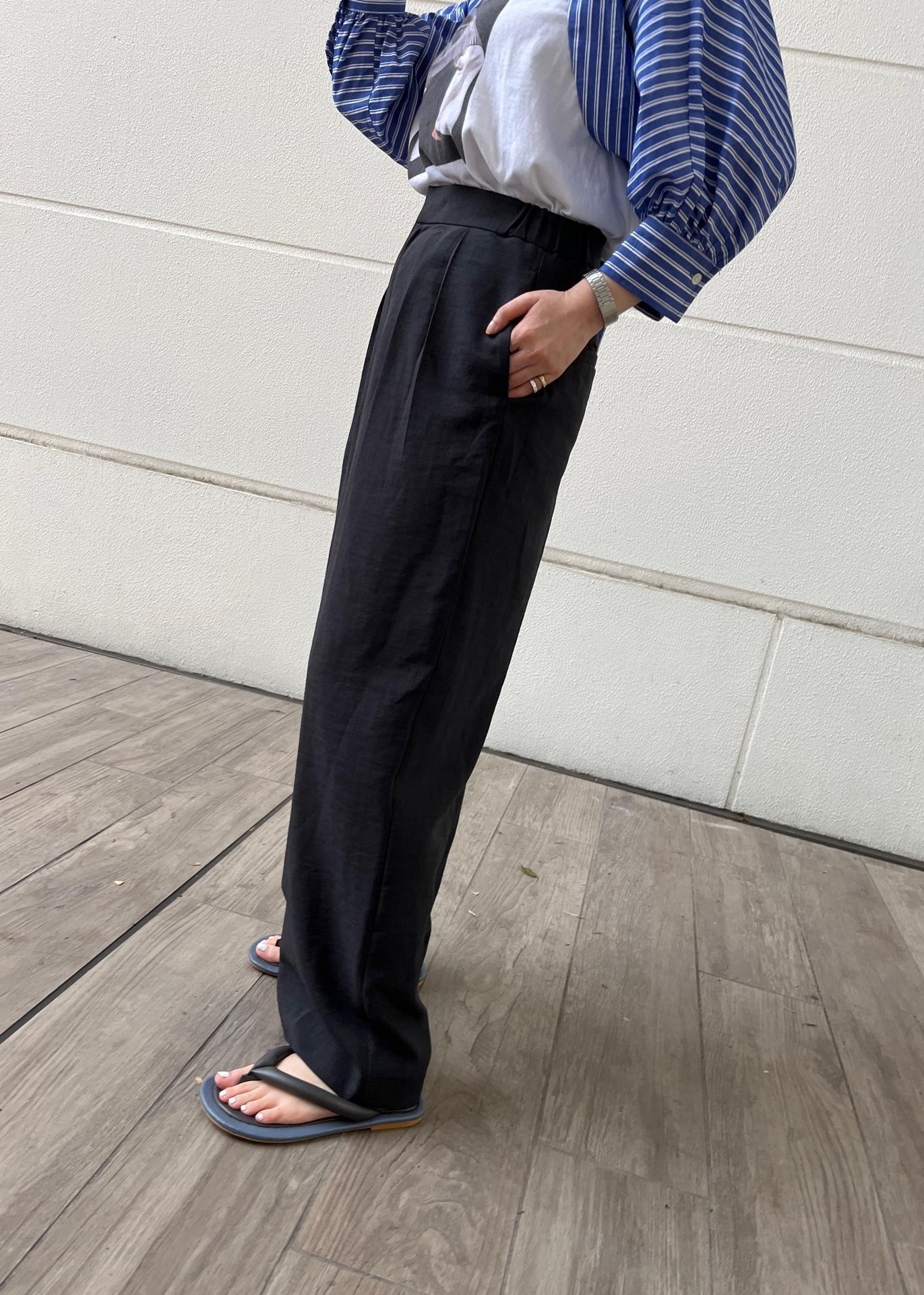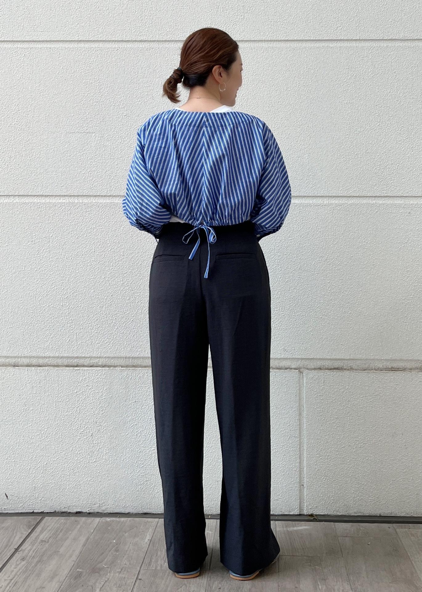 サイドゴムなので窮屈感はなく、前後ともにすっきりと着こなせる