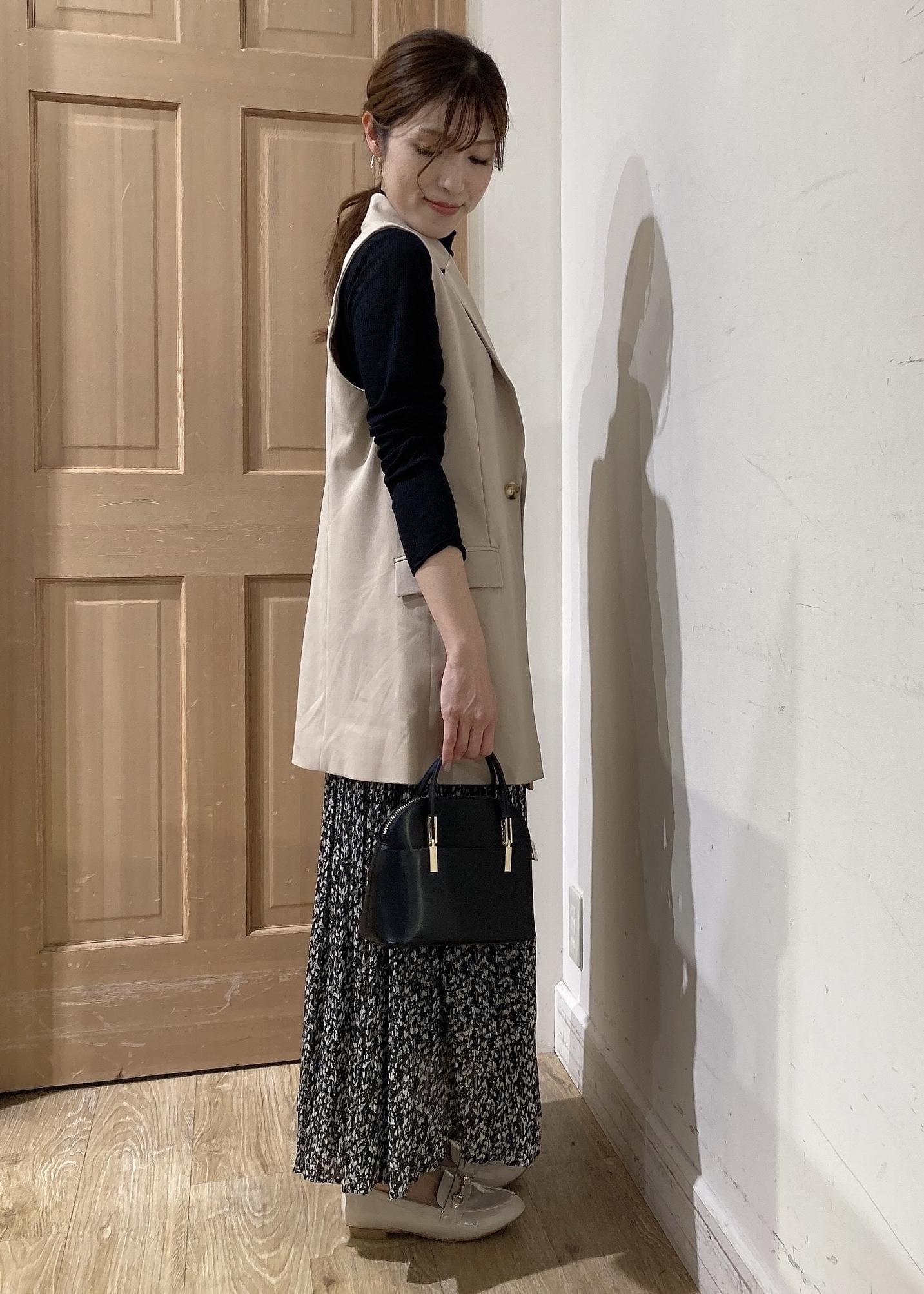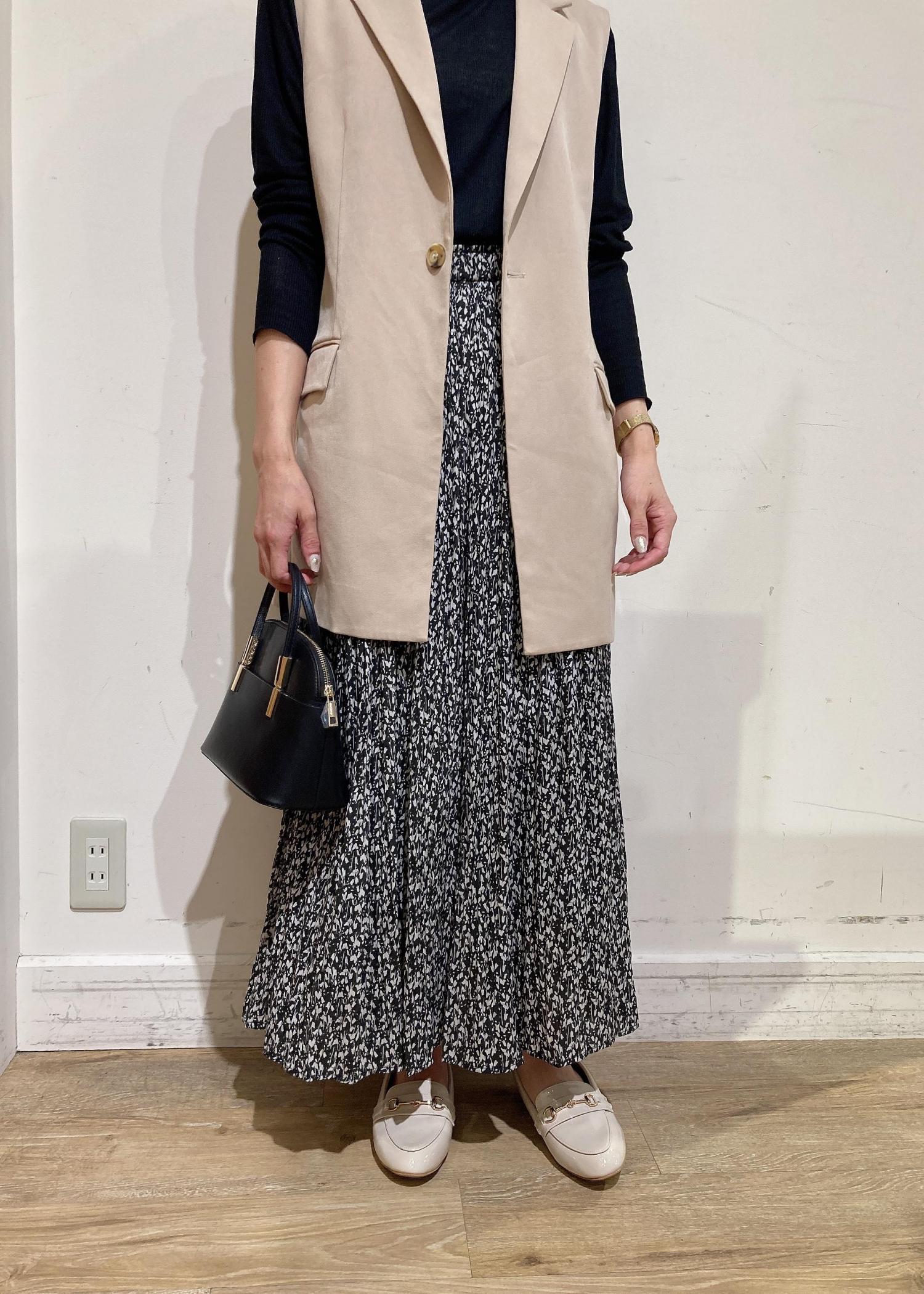 プリーツスカートにシアートップスを合わせジレを羽織ったコーディネートです。シンプルなコーデもジレを羽織ることで一気にオシャレ見えします!