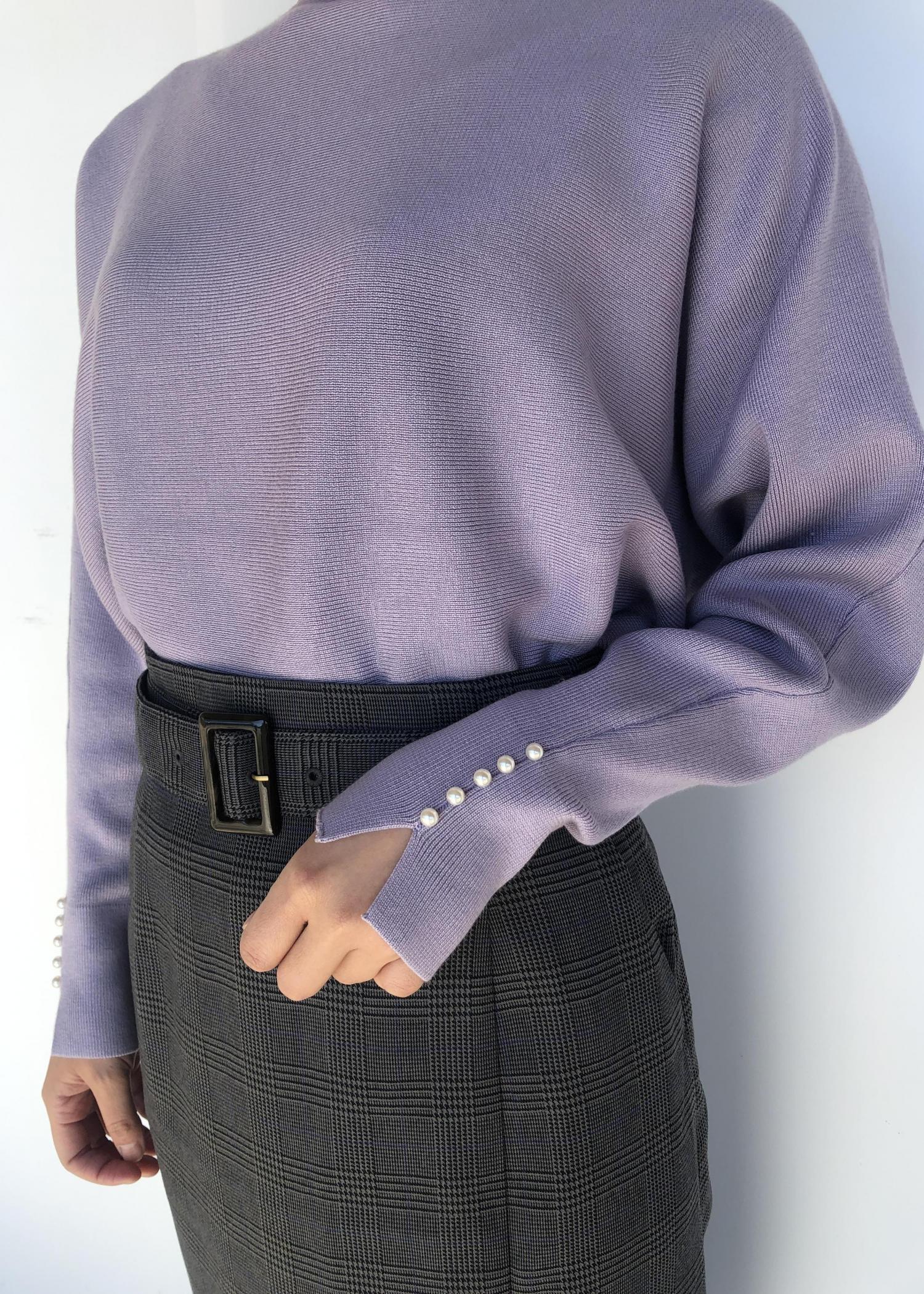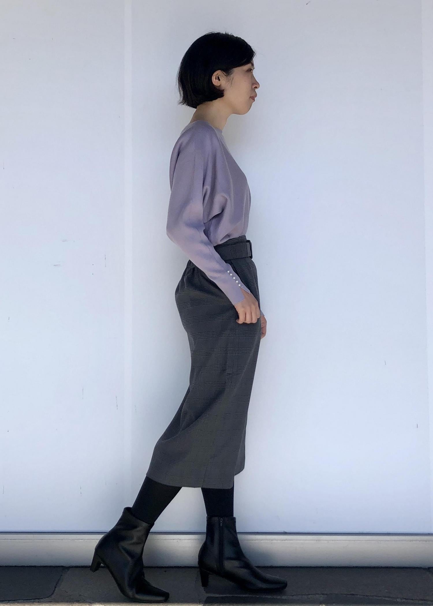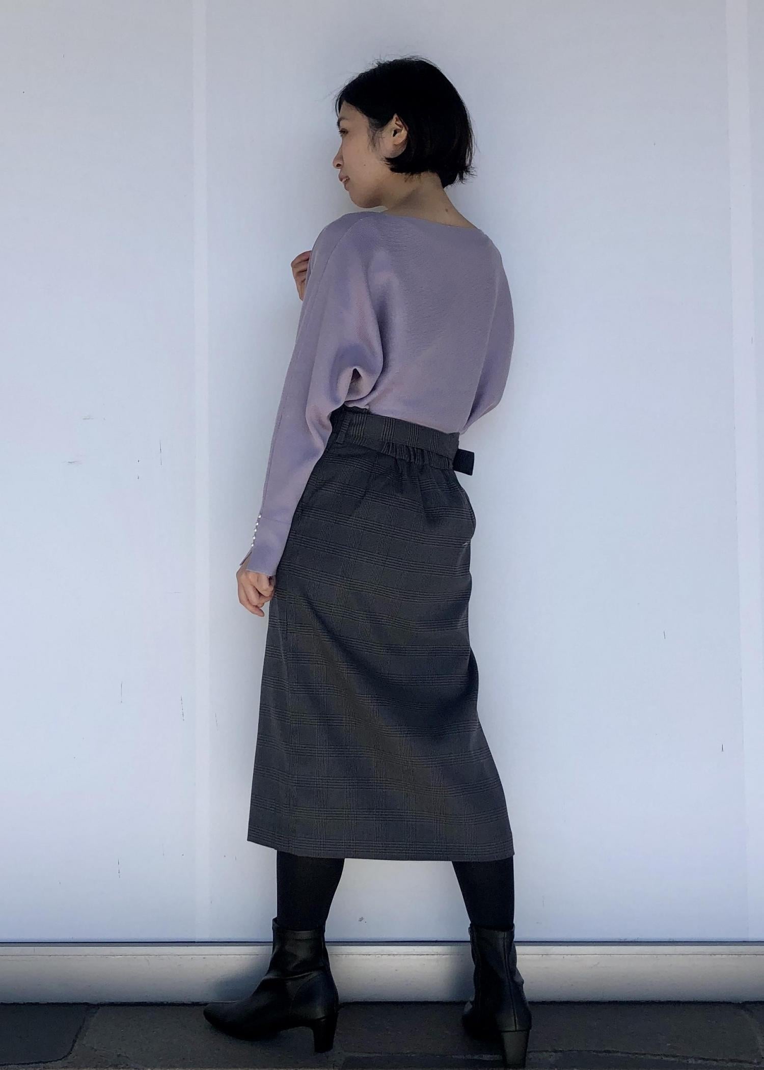 フロントタックによるラップ風スカート。 共布のベルトがついておりハイウエストでの着用が可能です。 ゆったりとしたドルマントップスをインすることで、Iラインシルエットを印象づけるキレイ目コーデに仕上げました。