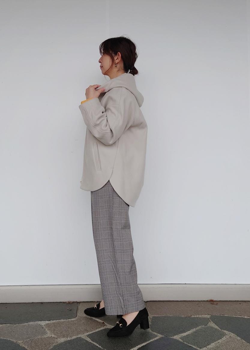 パンツはシンプルなチェック柄を合わせて、ビタミンカラーを引き立てました。
