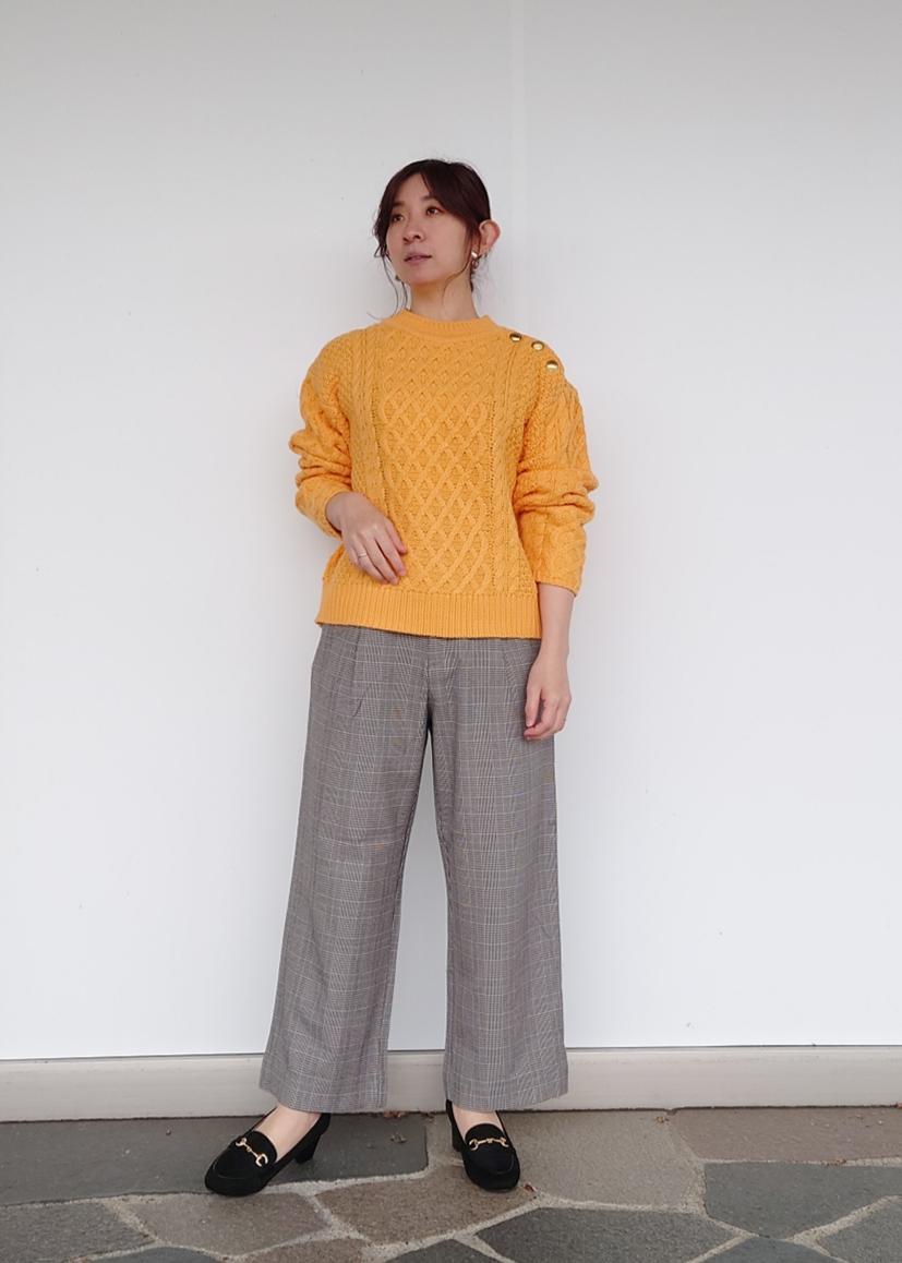 ケーブル編みですが、ゴールドボタンのおかげでカジュアル過ぎないスタイリングが叶います。