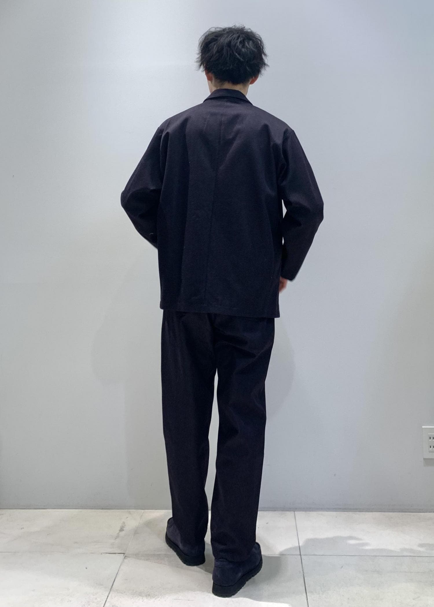 タテ糸は光沢のある上質な綿、ヨコ糸はウォッシャブルウールを使用し、毛織物産地愛知県津島の瀬尾毛織で限界まで高密度に織り上げたウールデニム。タテ糸の 藍色は江戸時代後期から藍染の産地である埼玉県羽生市で伝統的に染めている本藍染の色を手本に、色落ちのしない染料にて染色。艶やかな光沢感とウールの持つしなやかなハリコシが高級感ある表情です。