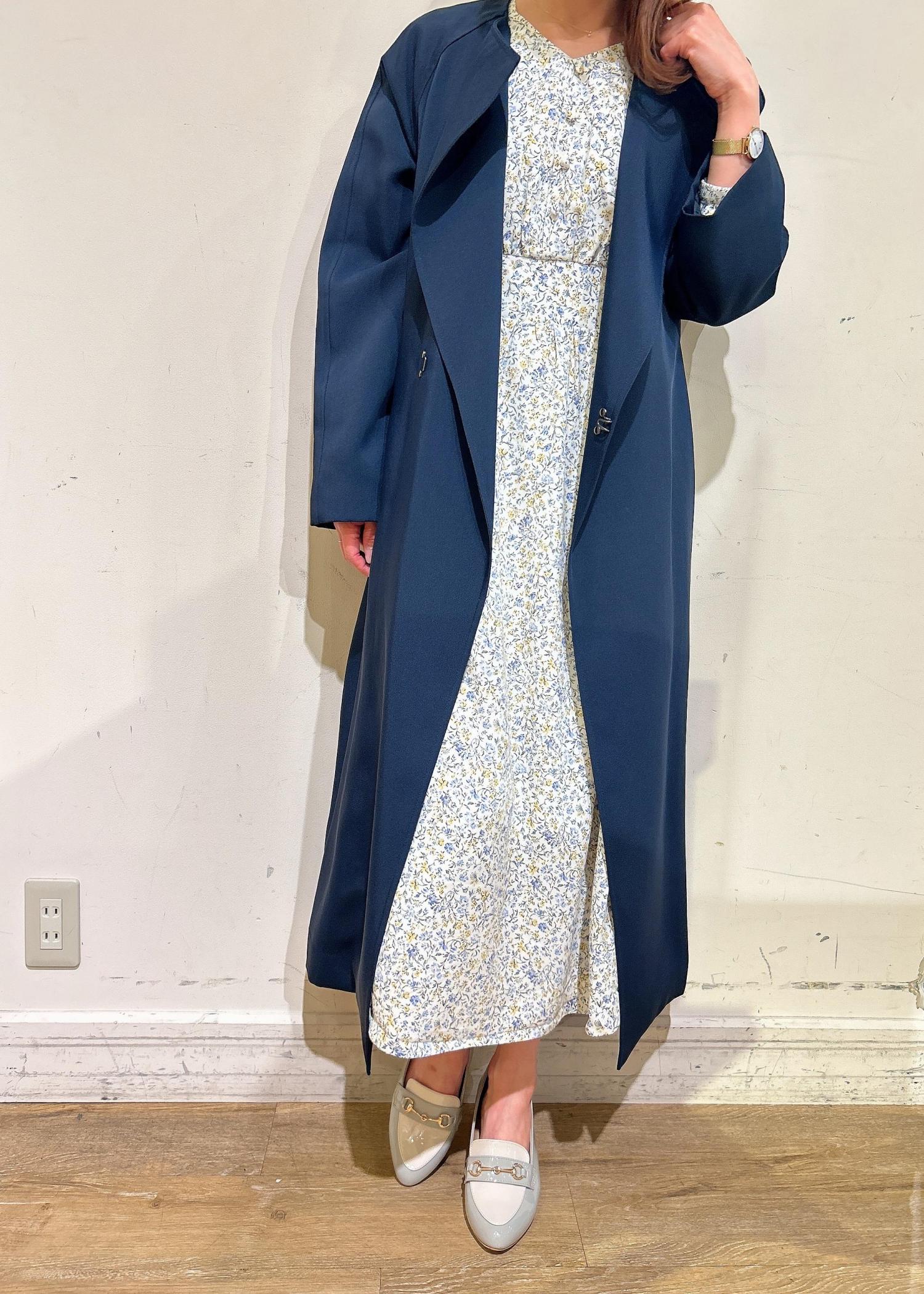 小花柄がフェミニンでキュートな印象なワンピースと機能性が高いコートを羽織った、お出かけコーデです。