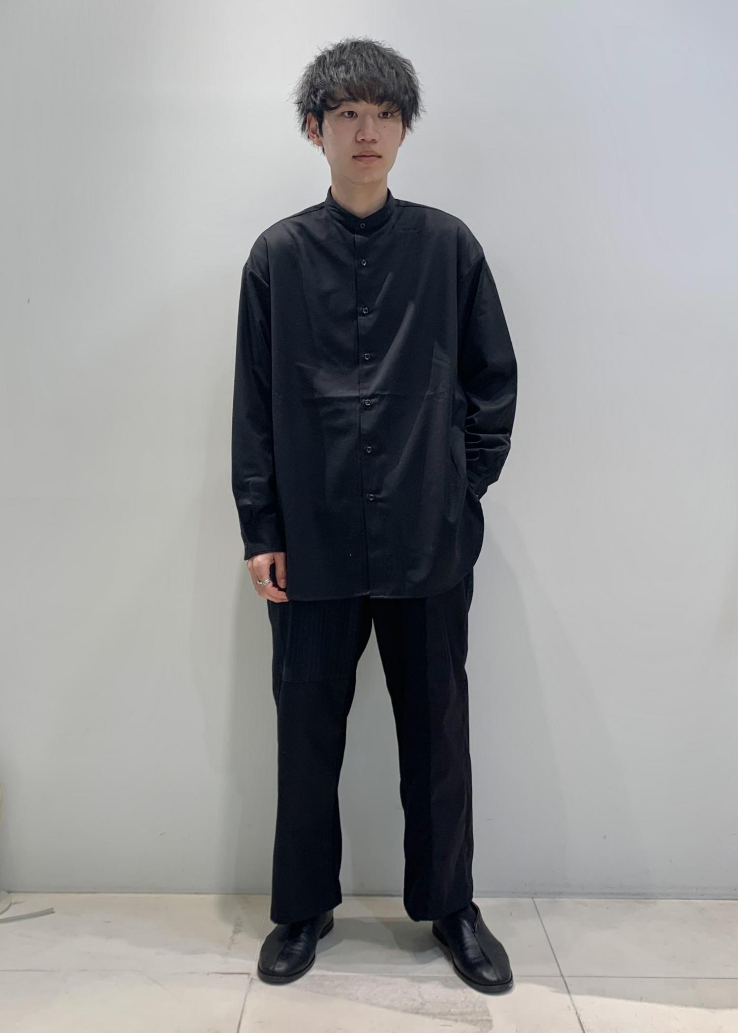 バサッと気軽に羽織ったり、さらりと1枚で着用しても生地のセミマットな質感が上質にみせてくれるバンドカラーシャツ。