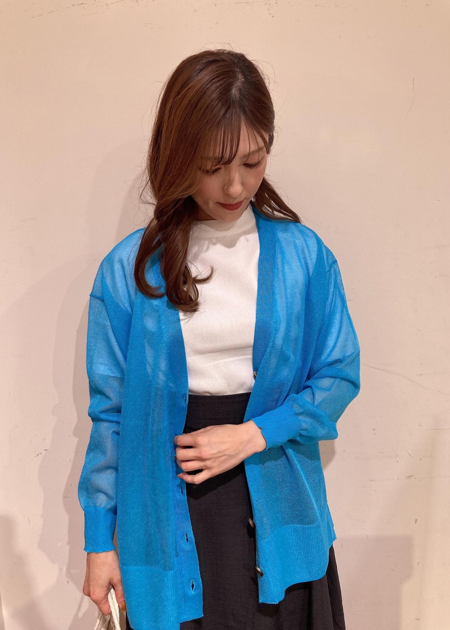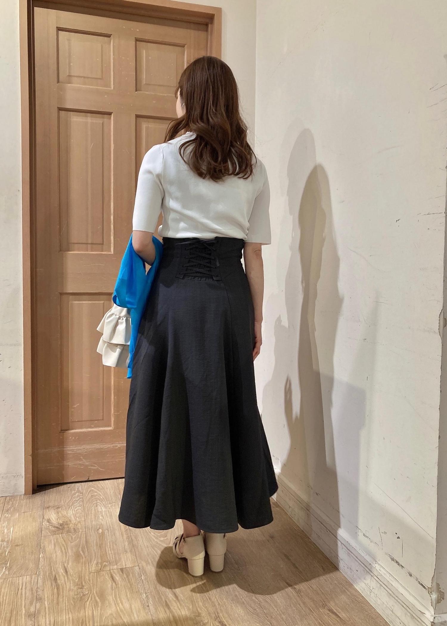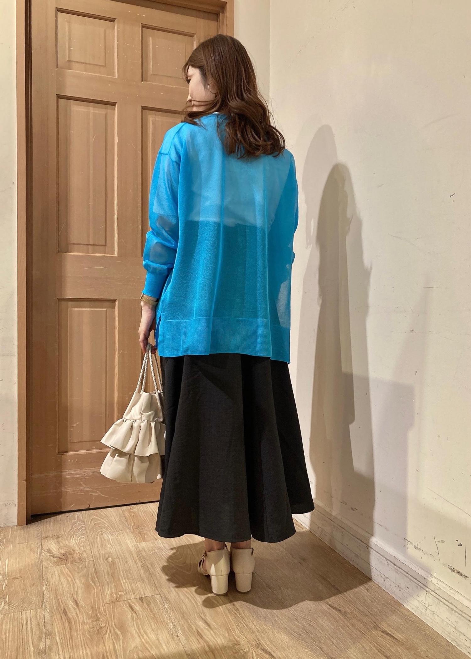 バックレースがポイントのフレアスカートにブルーのカーディガンを合わせました。スカートはリボンでウエスト調節可能です。シアーカーディガンで軽さをプラスしました。