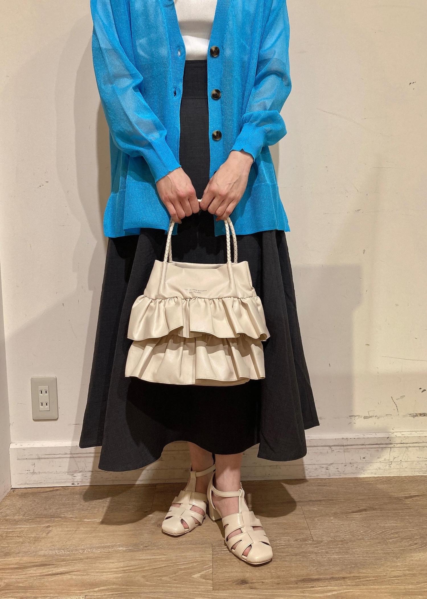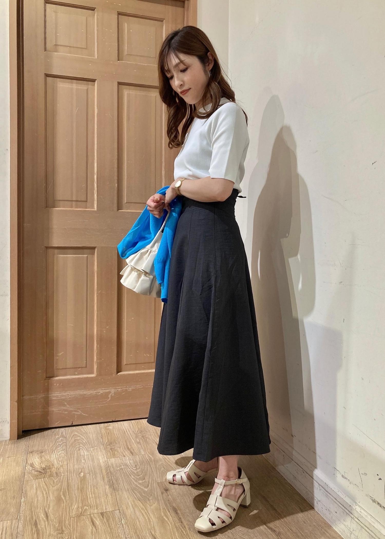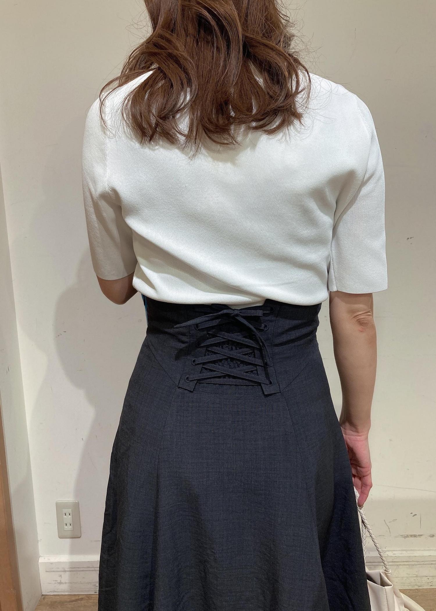 バックレースがポイントのフレアスカートにブルーのカーディガンを合わせました。スカートはリボンでウエスト調節可能です。シアーカーディガンで軽さをプラスしました。