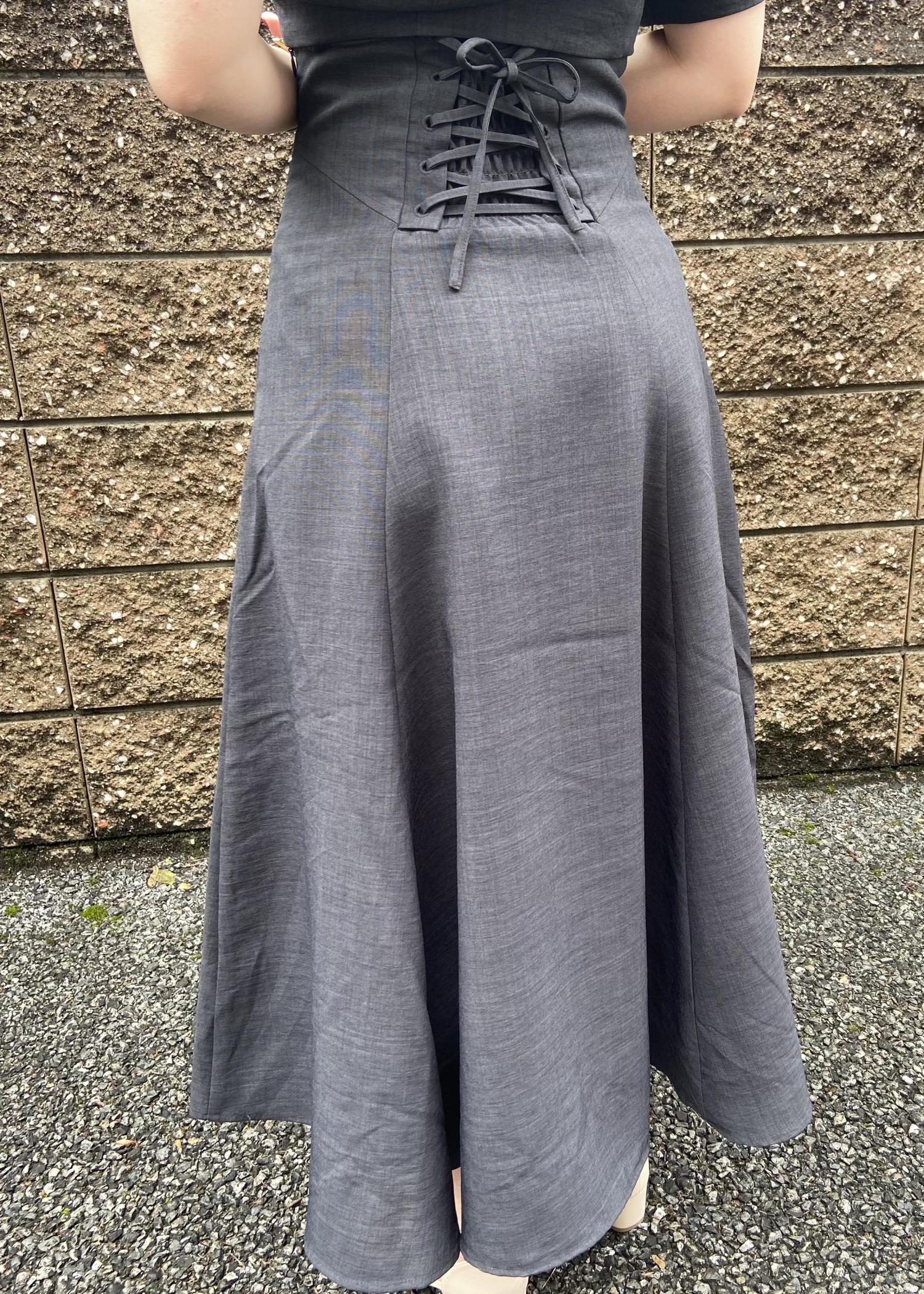 大人可愛いなセットアップコーデにしました。 シルエットが女性らしいので、色を落ち着きのあるチャコールにしました。 スカートの後ろのレースアップがとてもオシャレでワンポイントになります!