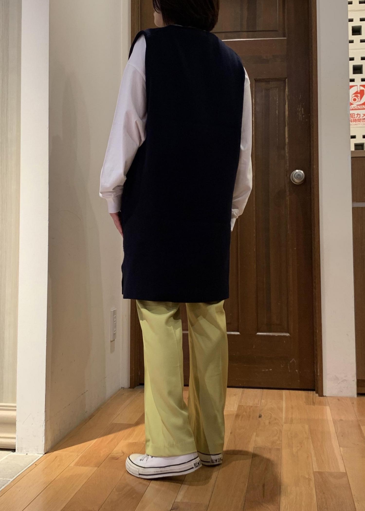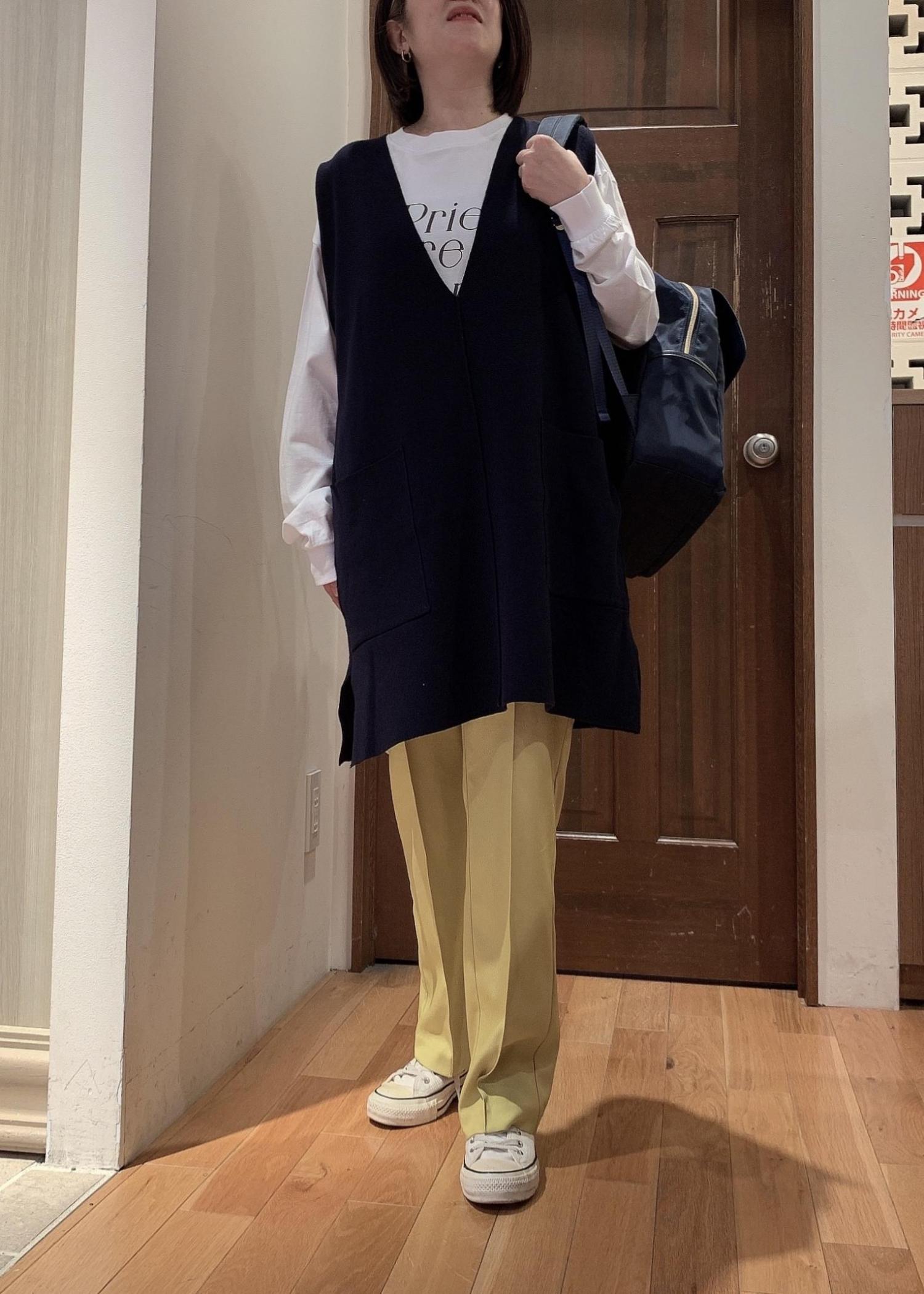 季節の変わり目でロンTとベストをレイヤードスタイルです。 鮮やかなイエローのパンツをアクセントにしました。