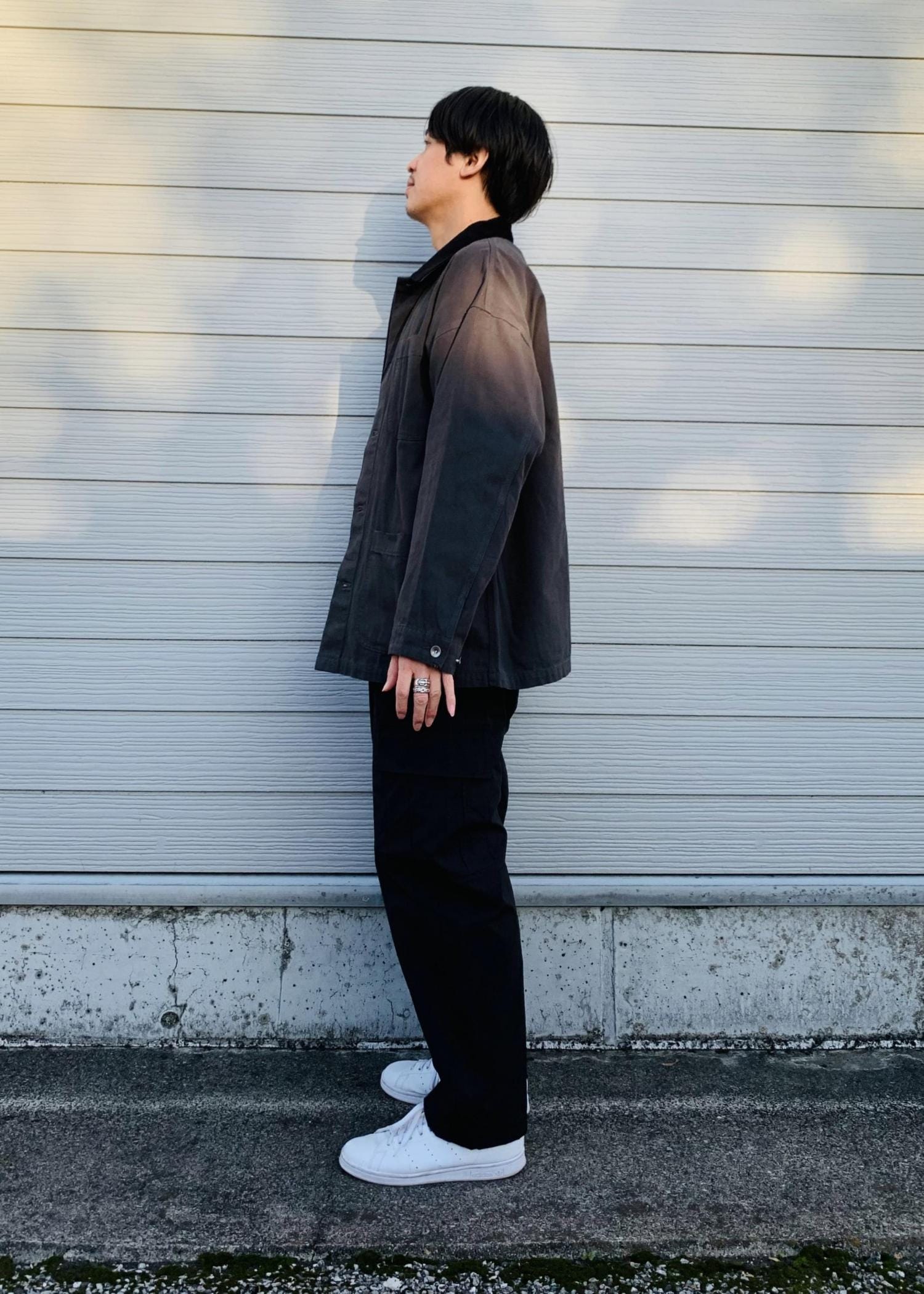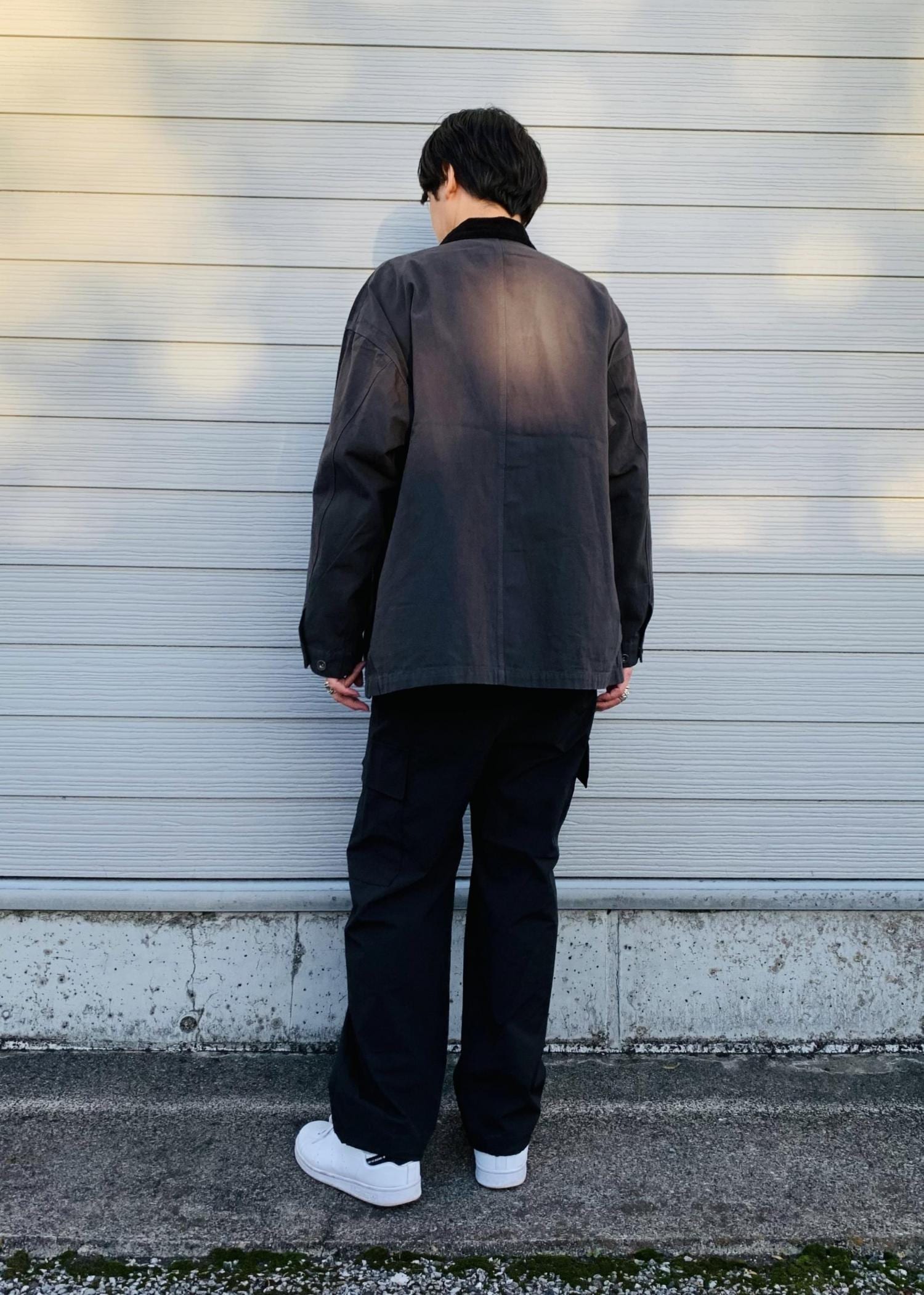 ブラックを基調にワークスタイルの定番カバーオールとカーゴパンツをシックにまとめました。