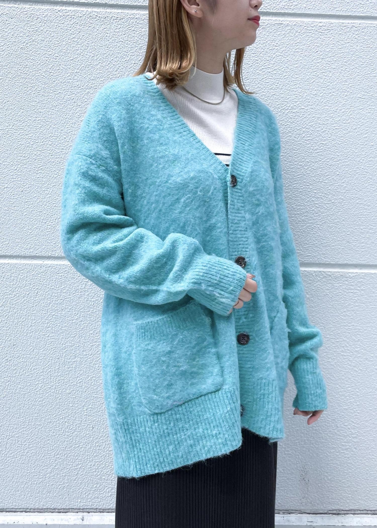 パっと目を引くブルーのシャギーニットカーディガンを使ったカジュアルスタイルです。