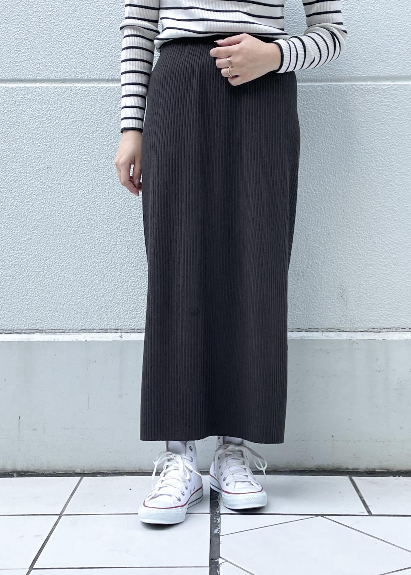 カーディガンがゆるっとしたシルエットなので、ボトムスはIラインスカートを合わせてメリハリをつけました◎