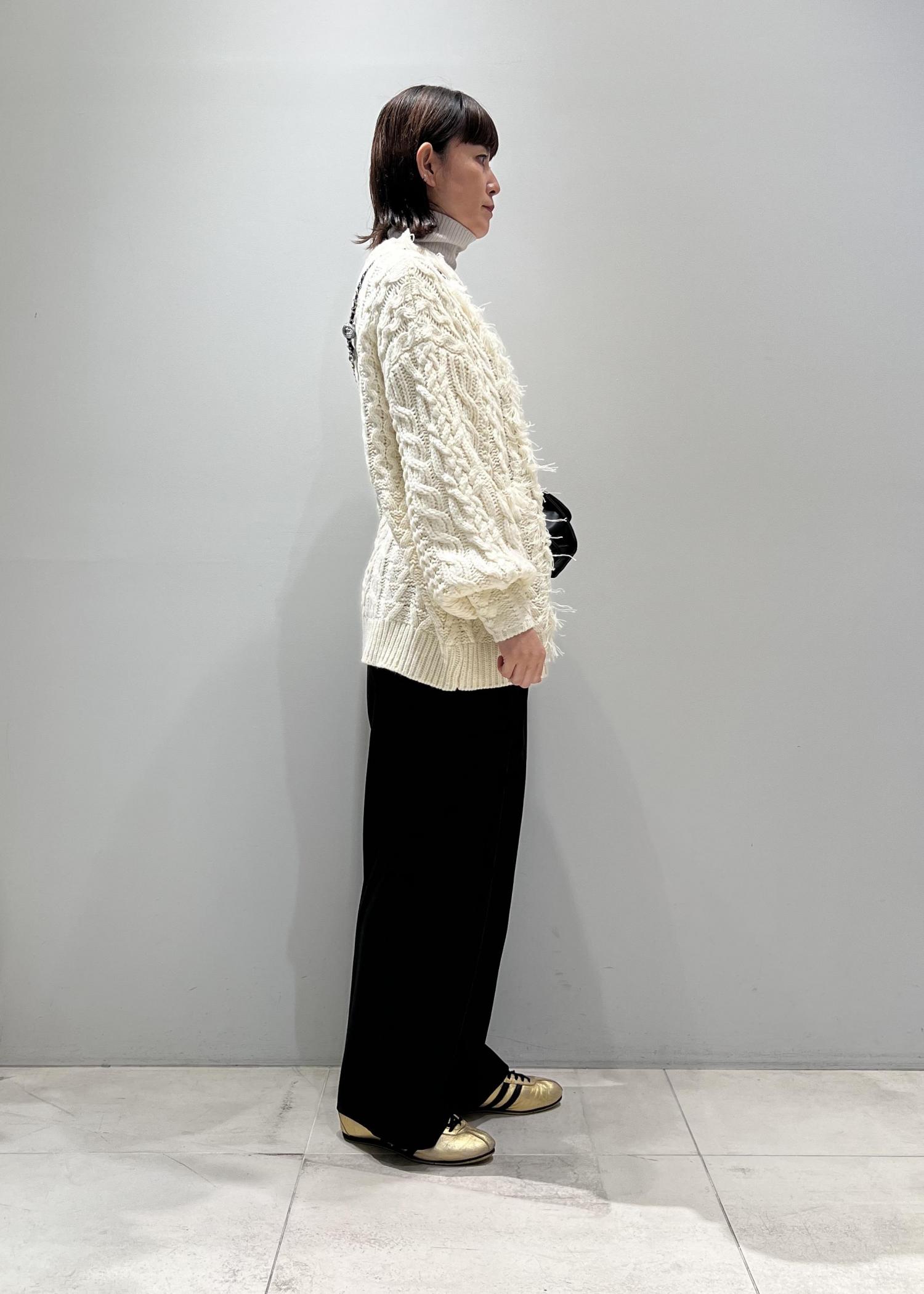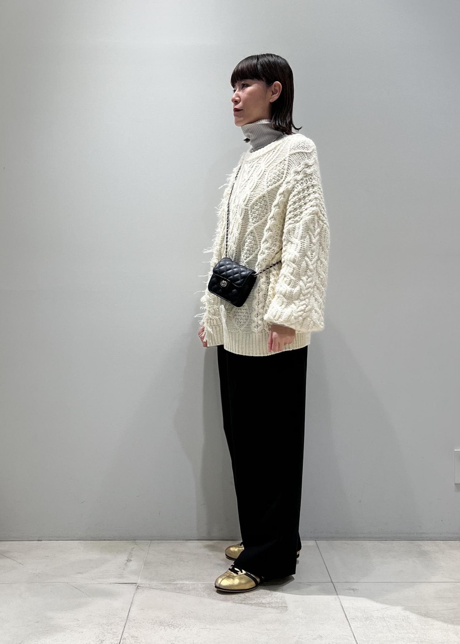 変則的なパターンとフリンジがポイントのケーブル編みニットは シンプルなパンツに合わせるだけでこなれた雰囲気に ざっくりボリュームのあるシルエットですがとても軽く柔らかいので普段使いに着回しやすいアイテムです ニットのバリエーションの1つとして取り入れてみては♩