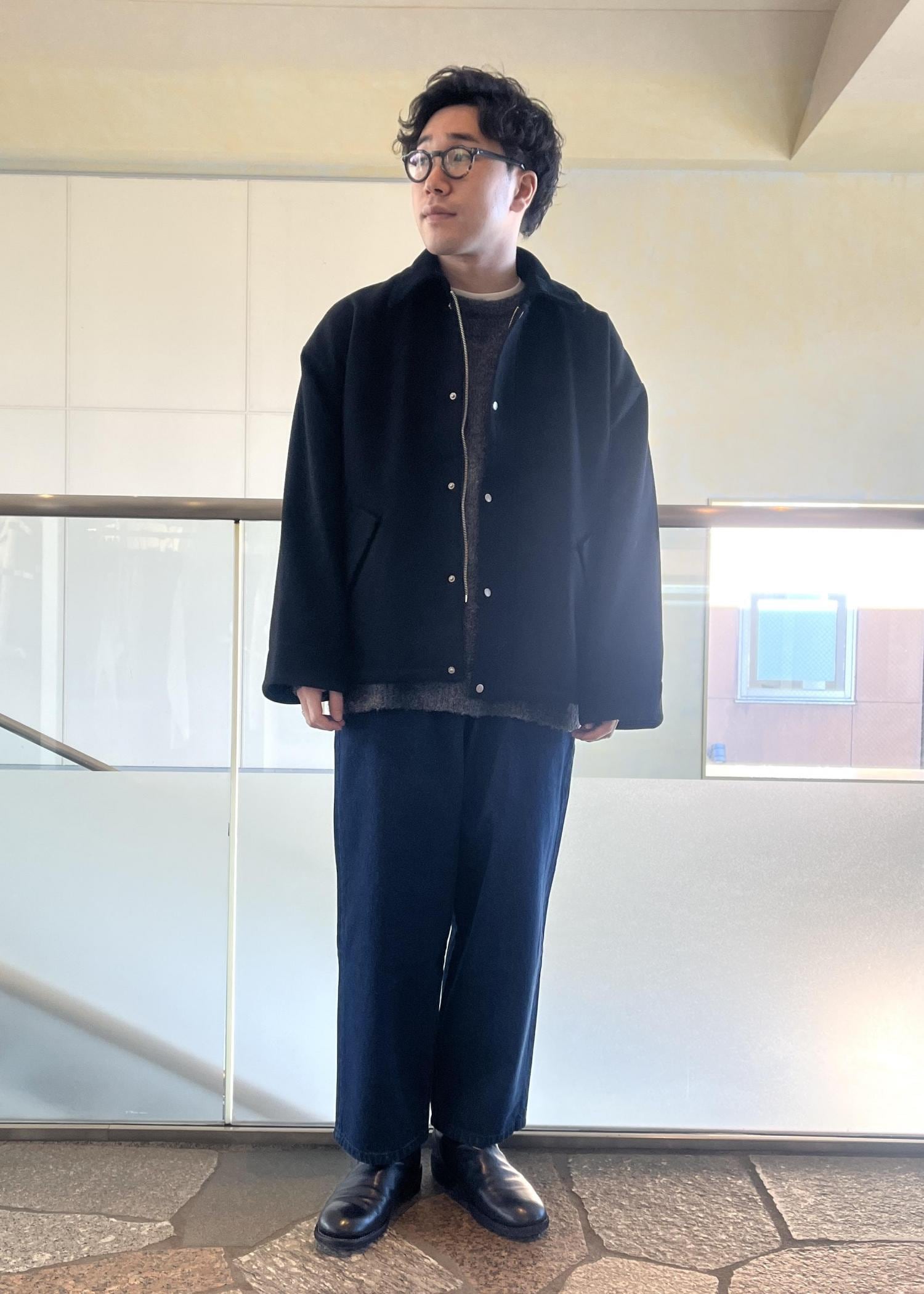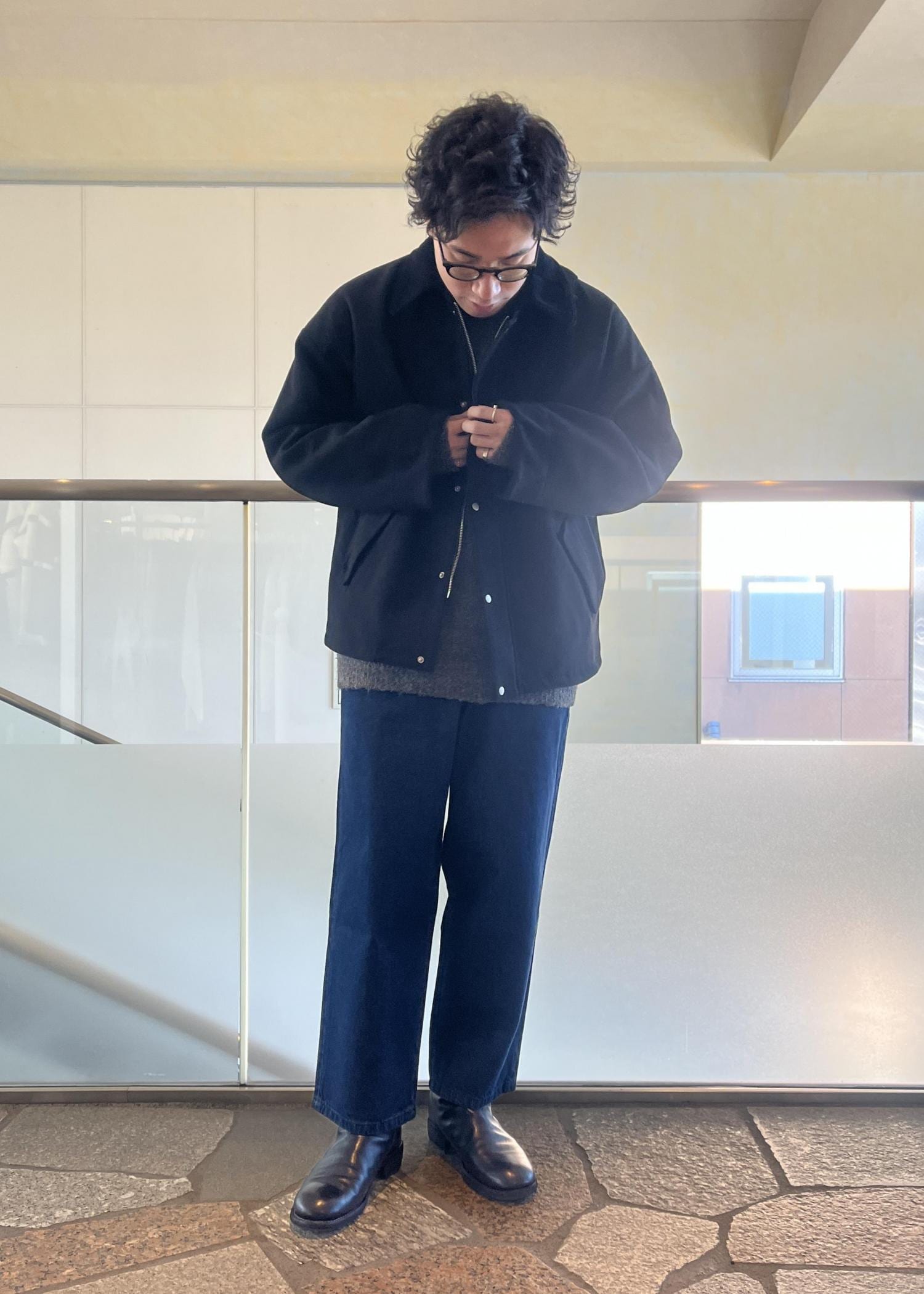ブルゾンはウールのようなメルトン生地を使用しており、肌触り抜群。軽いハリ感と適度な光沢があり上品な印象です。