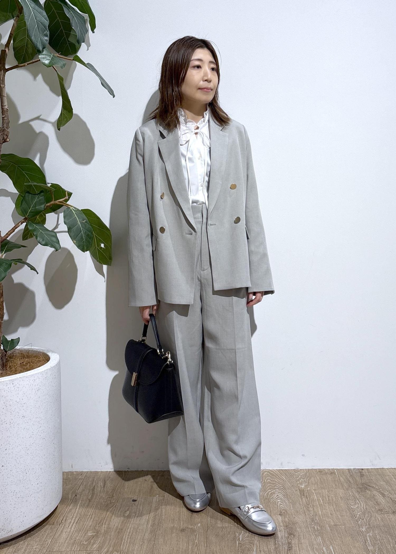 ワイドパンツ+ブラウス合わせでキレイめに。