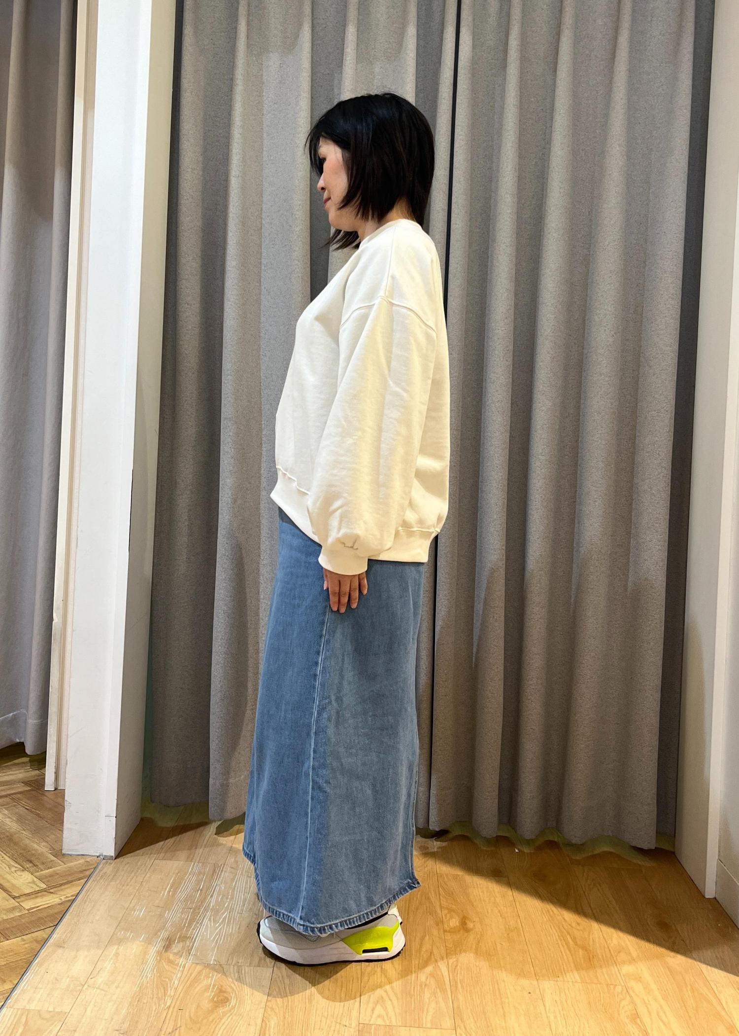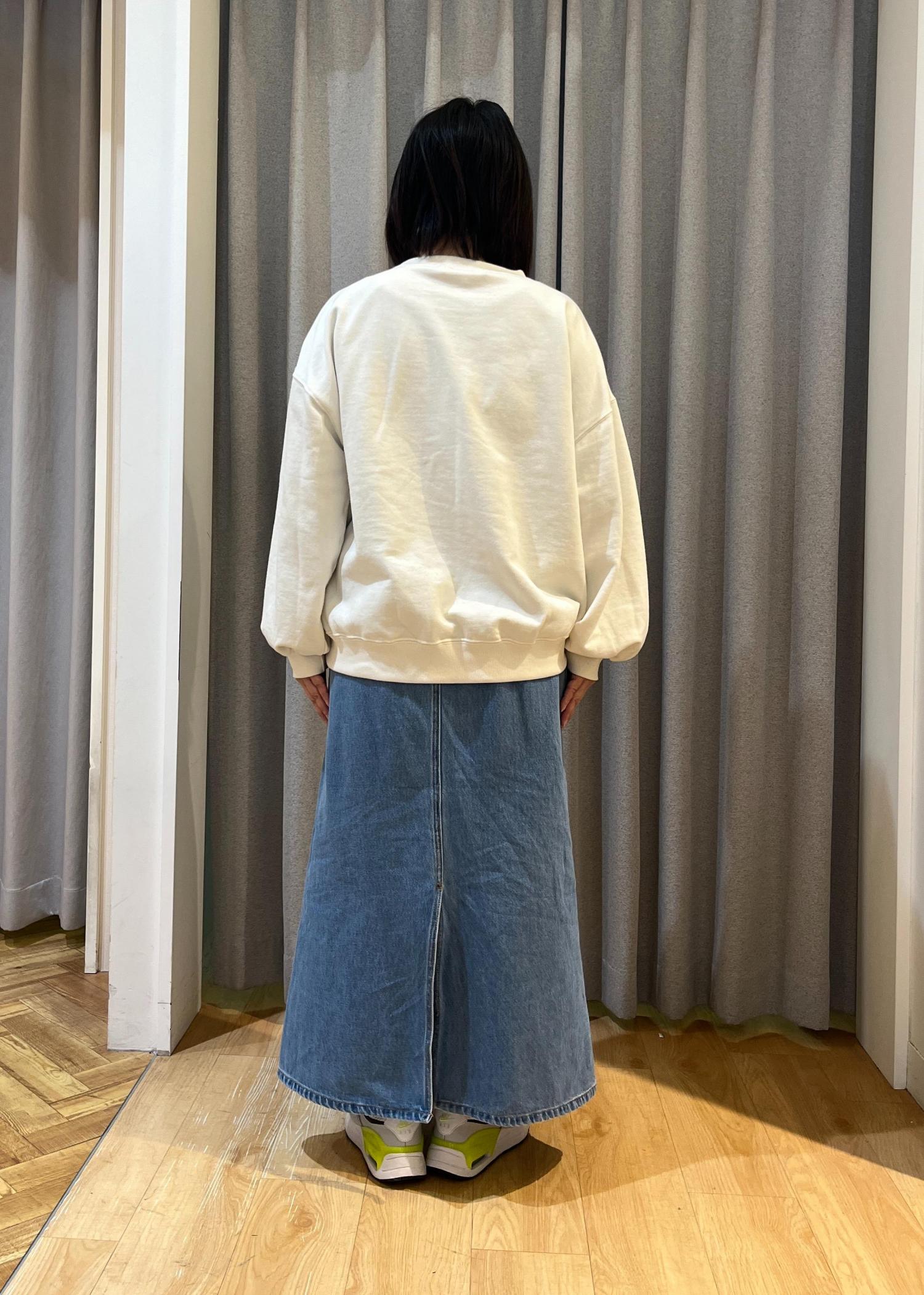 ゆったりめのスウェットにタイトシルエットのシンプルなデニムスカートを合わせました。 柔らかいスウェットに後ろスリット入りのスカートなので、動きやすく快適に着ていただけます。
