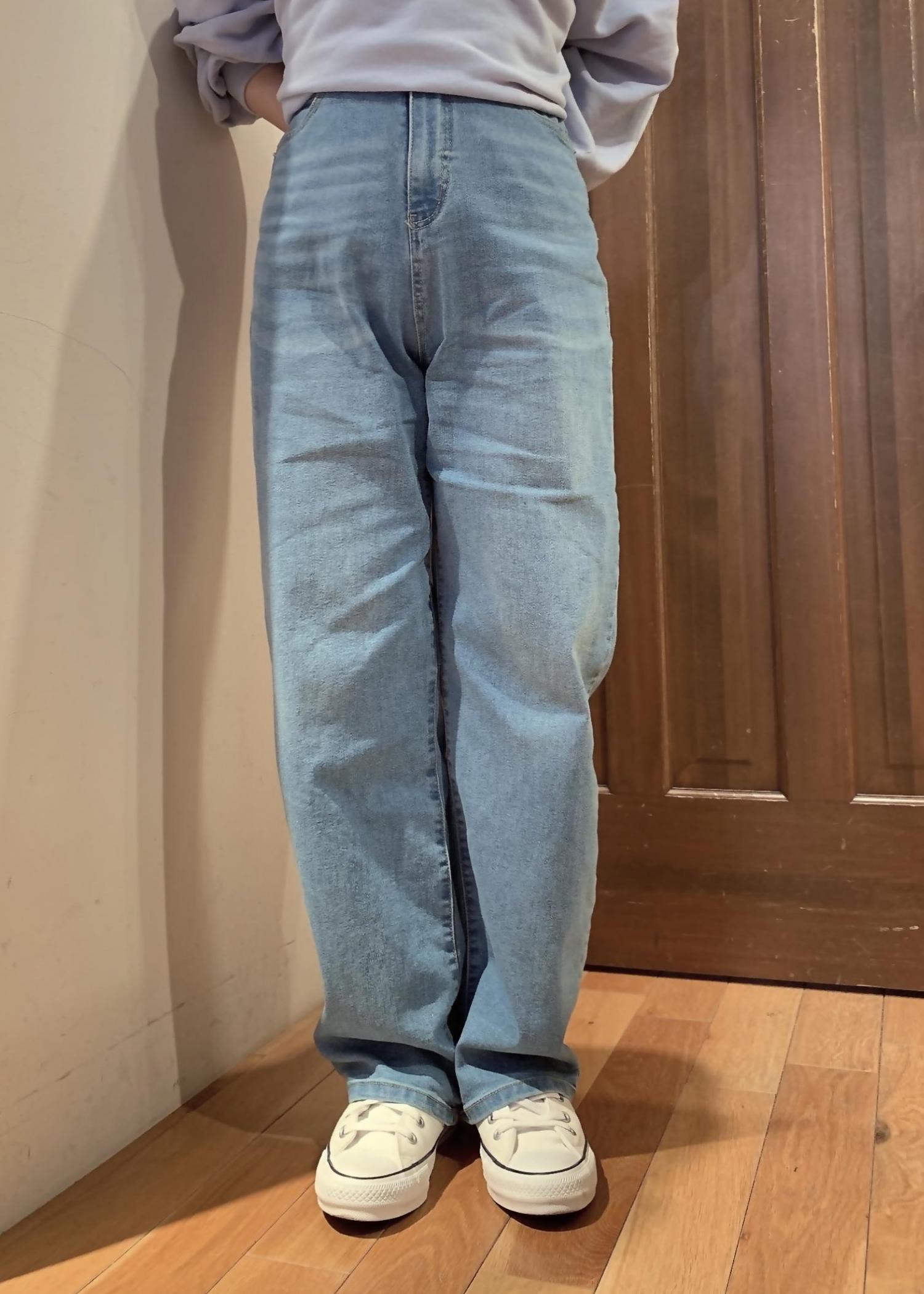 春らしいデニムパンツを同色のオーバーサイズなスウェットで合わせたワントーンコーデです。 スニーカーでスポーティーな合わせにしました。